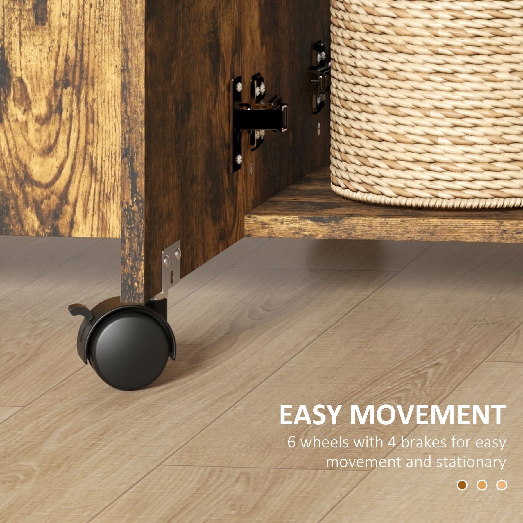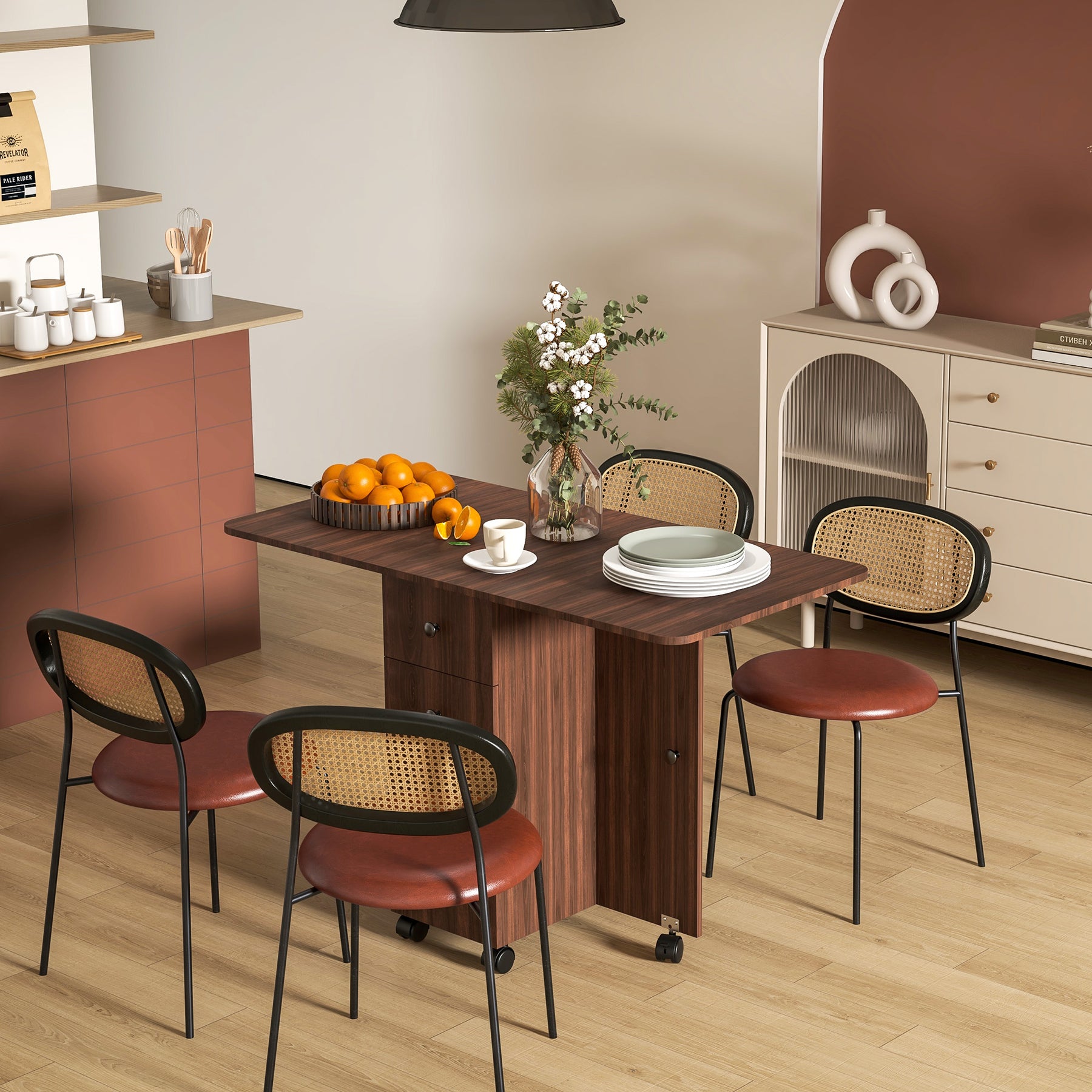 Choose this folding dining table from HOMCOM as a space-saving option when needed. It has an expandable design where both sides lift to provide additional space with a maximum capacity of 4 to 6 people or can be reduced to a compact size. It has two drawers and a cabinet that offers discreet storage. It also has six wheels, of which four have brakes allowing easy movement or staying in a fixed place.