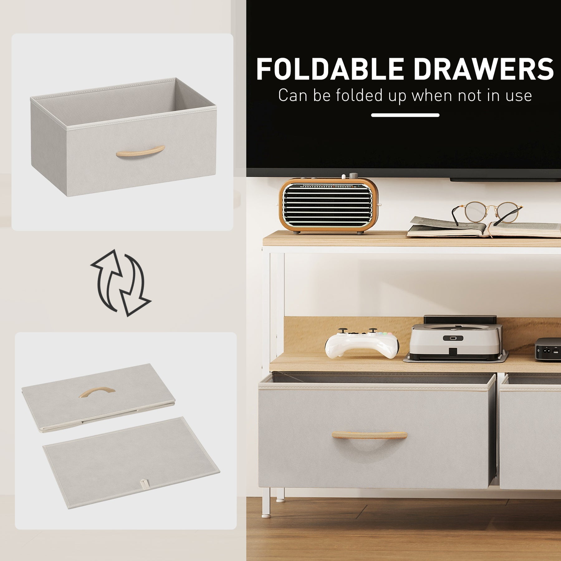 Create a stylish, modern centerpiece in your living room or entertainment room with this HOMCOM TV unit. It adopts dual colours to brighten up your living room perfectly. The top can hold up to a 47-inch TV, and the middle shelf can hold DVDs, remote controls, and more. Two collapsible drawer boxes add a stylish and intelligent touch, while the built-in charging station offers convenient power access for your devices. This entertainment unit is a great choice to take home.