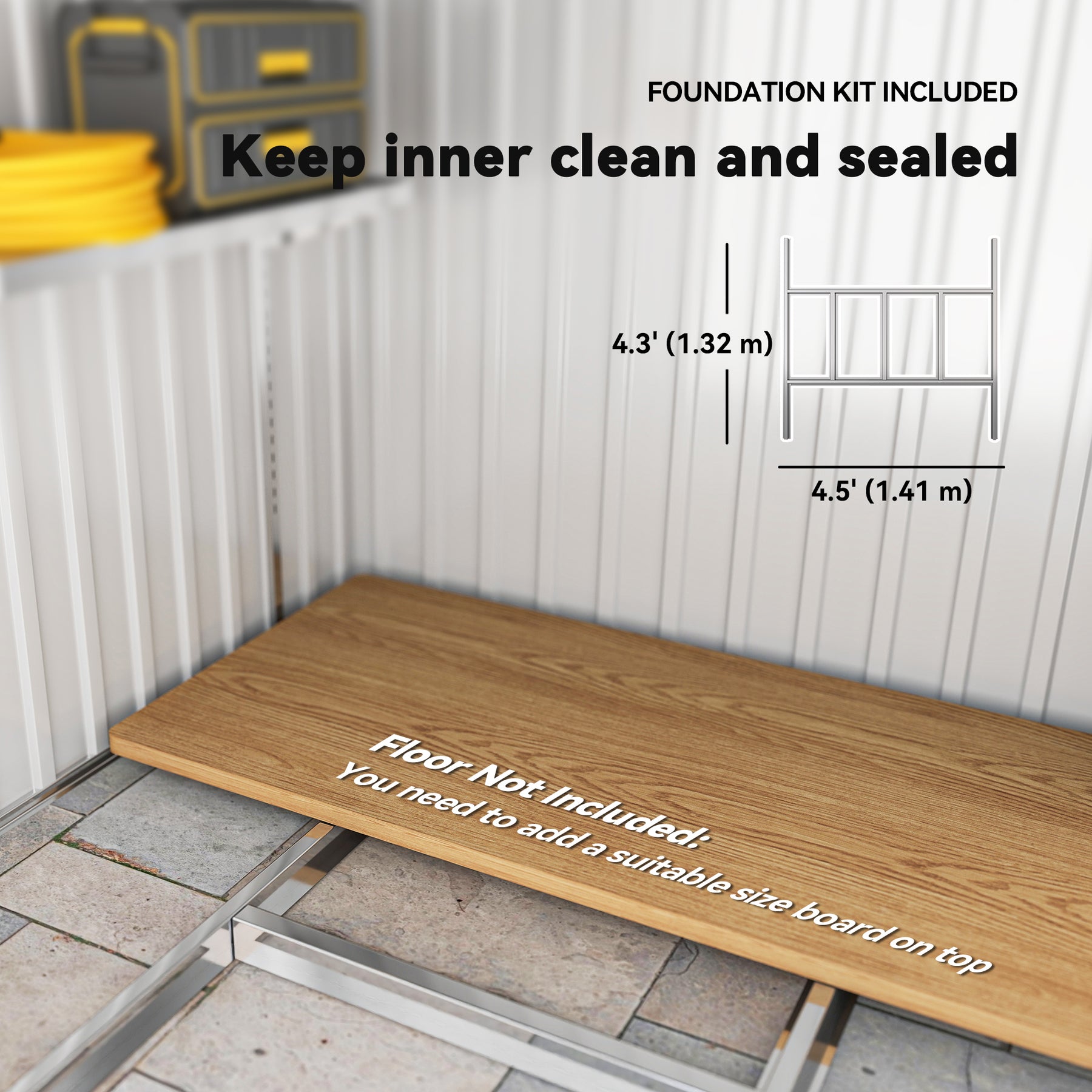 - • Floor foundation included so that your storage items won't touch the floor directly