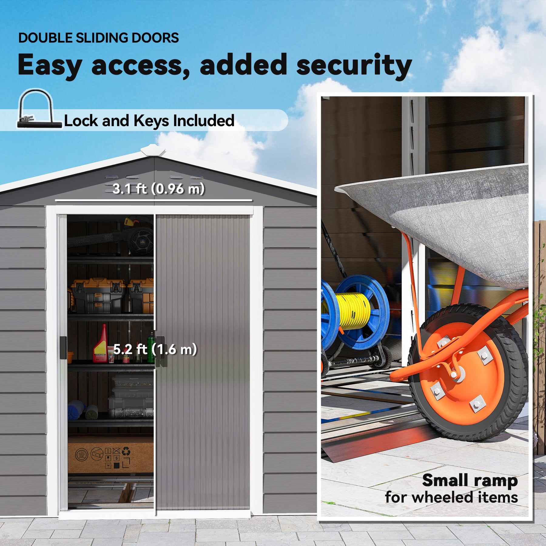 Easily add storage space and value to your property with an outdoor storage shed from Outsunny. Keep expensive equipment safe from harm with its waterproofed galvanized roof. Mitigate moisture and musty odours with ventilating windows. The door is equipped with a locking mechanism for added security. Roll out your lawnmower with ample space to spare and store shovels, seeds, soil, and rakes. Get outdoors, get productive, get Outsunny.