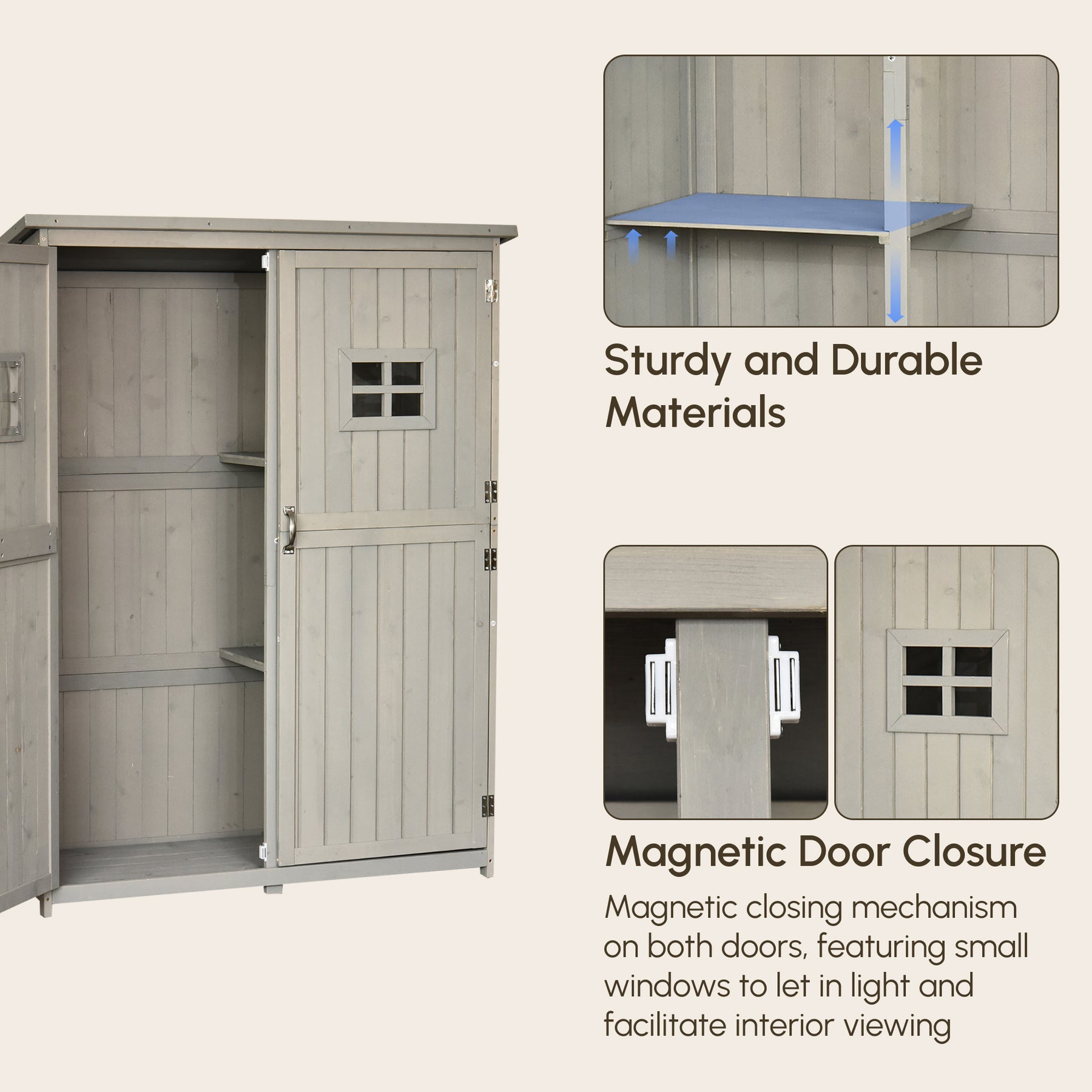 Give your gardening tools and outdoor essentials a great storage and organization place with this outdoor shed kit from Outsunny. Made from solid fir wood for enduring reliability and strength, with a light grey waterproof top coat to protect against the mild elements, tool cabinet features three shelves on the right and the other half is kept shelf-free, leaving plenty of space to store small and larger sized items alike. A stylish solution to all your garden storage needs.
