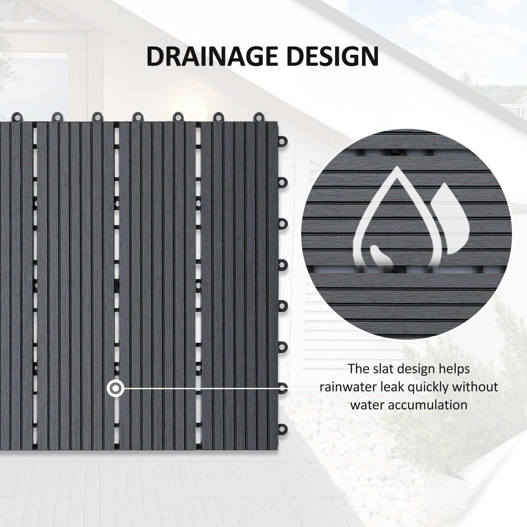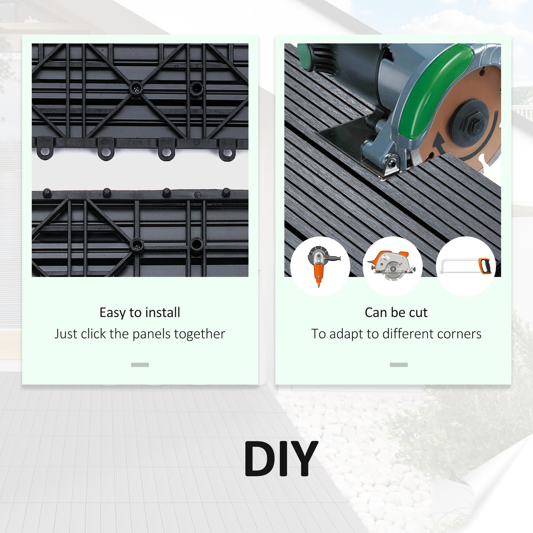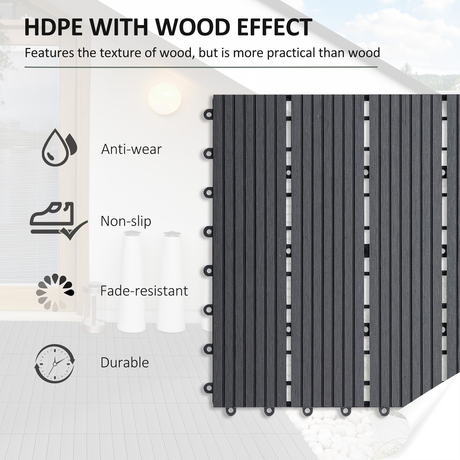 Enhance your outdoor areas with these Outsunny tiles, which are suitable for all exteriors. Weather-resistant and featuring non-slip, fade-proof properties, these garden tiles effortlessly snap together to meet diverse requirements. They are low-maintenance and simple to clean using water and a brush. This set includes 11 tiles, each measuring 11.8" x 11.8" (30 x 30 cm), covering an area of 11 sq.ft (1 m²).