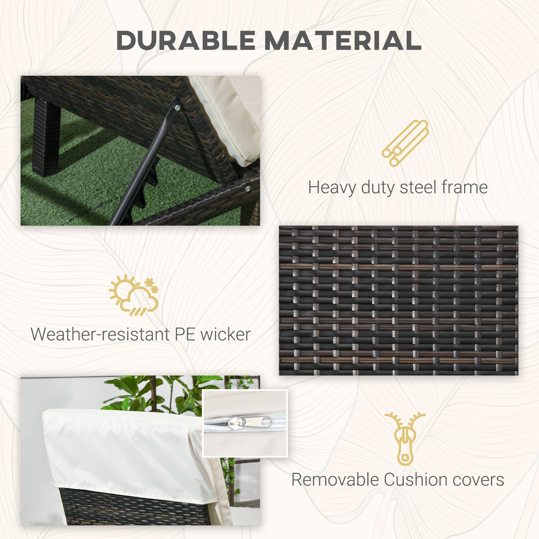 Lounge in luxury, whether in the poolside or patio outdoors - thanks to this sun lounge from Outsunny. Formed of a powder coated galvanized steel frame with PE wicker wrapped around: weather-resistant and beautiful. The reclining backrest is 5-level adjustable, so you can choose an angle most comfortable for you. The outdoor lounge chair comes with padded cushion and headrest; the polyester cover can be washed to keep it clean. Style and comfort, blended into together.