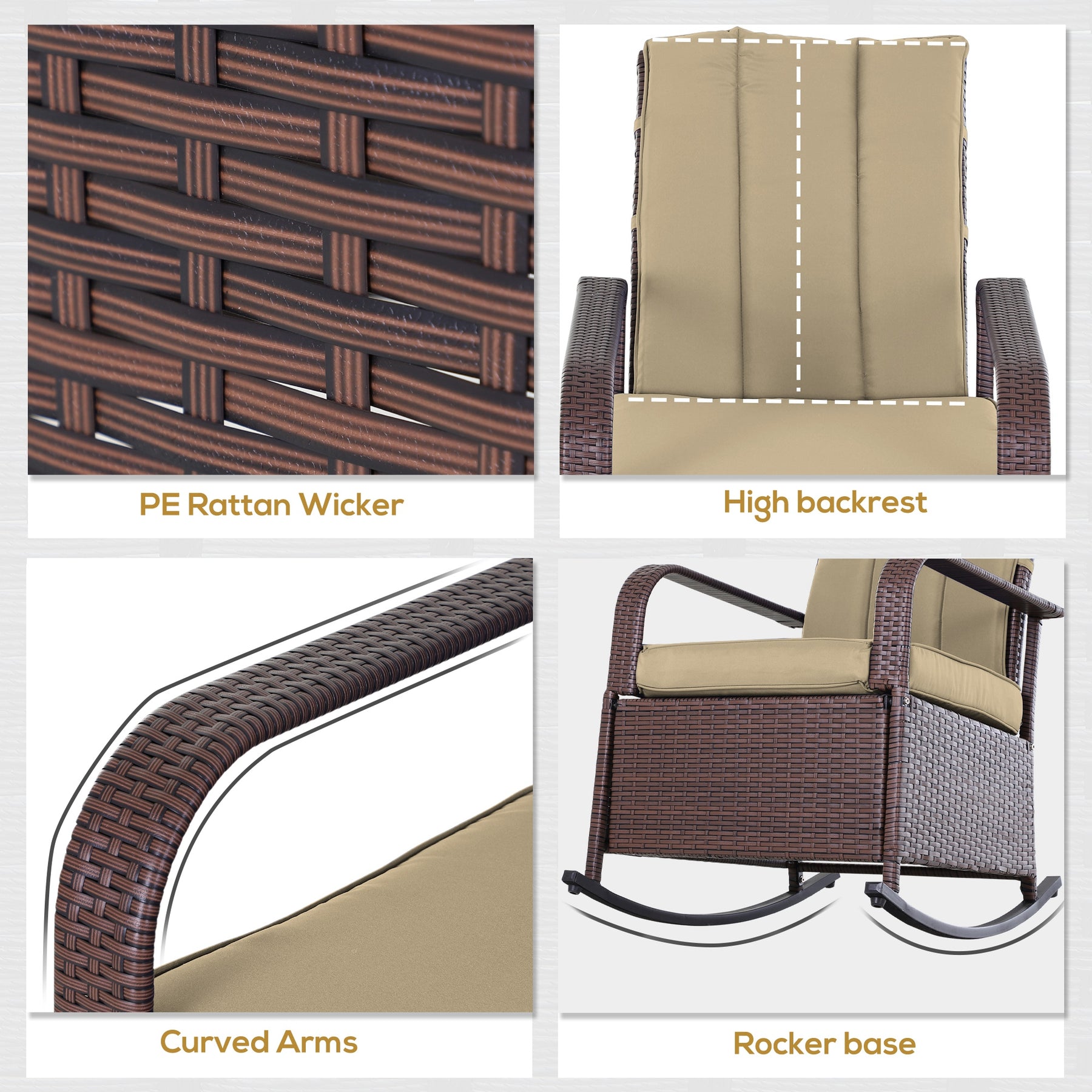 The Outsunny rocking patio chairs adjustable reclining rocking chair with footrest reclines up to 135 degrees to help you find the most comfortable position. The soft, padded cushions allow you to sit or lie on the chair with your whole body comfortably relaxed. The patio rocker chair is made of weather-resistant and wear-resistant woven PE wicker to provide superior durability and stability and also cleaning convenience.