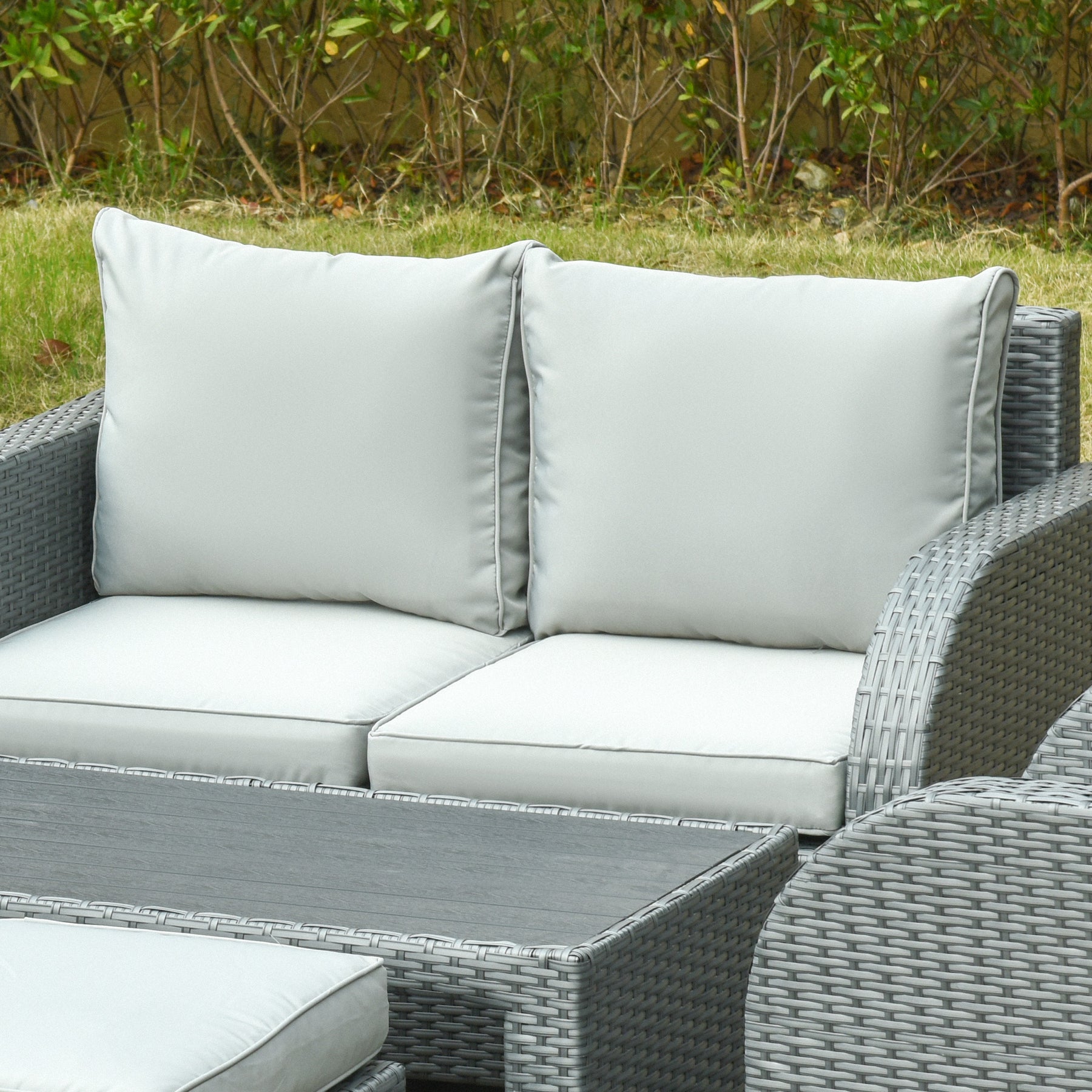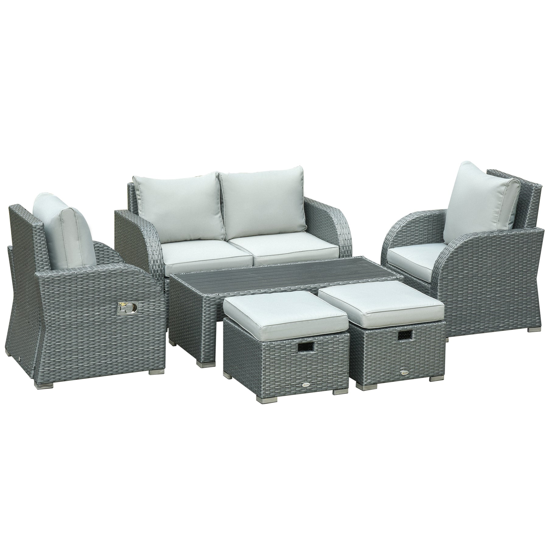 Experience the splendor of the outdoors, rivaling the comforts of indoor living. Our 6-piece wicker patio set features spacious 2-seater sofas and 2 single recliners, fulfilling your dream with ease. The adjustable recliners allow you to find your perfect angle for utmost relaxation and enjoyment. Additionally, two footstools provide extra seating space, while the coffee desk offers a convenient spot for drinks and snacks. Embrace the wonders of outdoor living with this exquisite patio set.