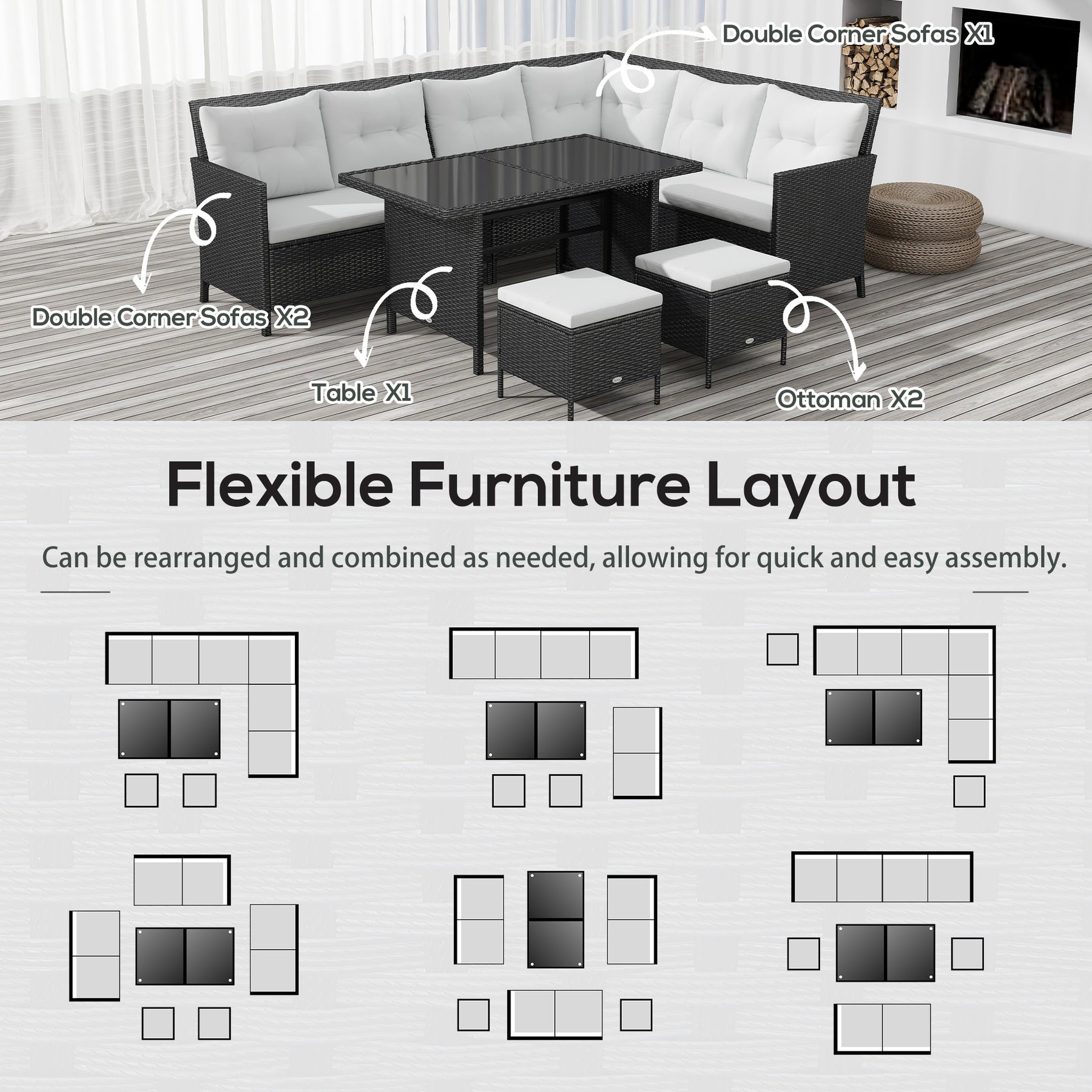 - • 6 pieces of rattan patio set include 3 corner sofas, 1 table and 2 ottomans for max 9 seats
