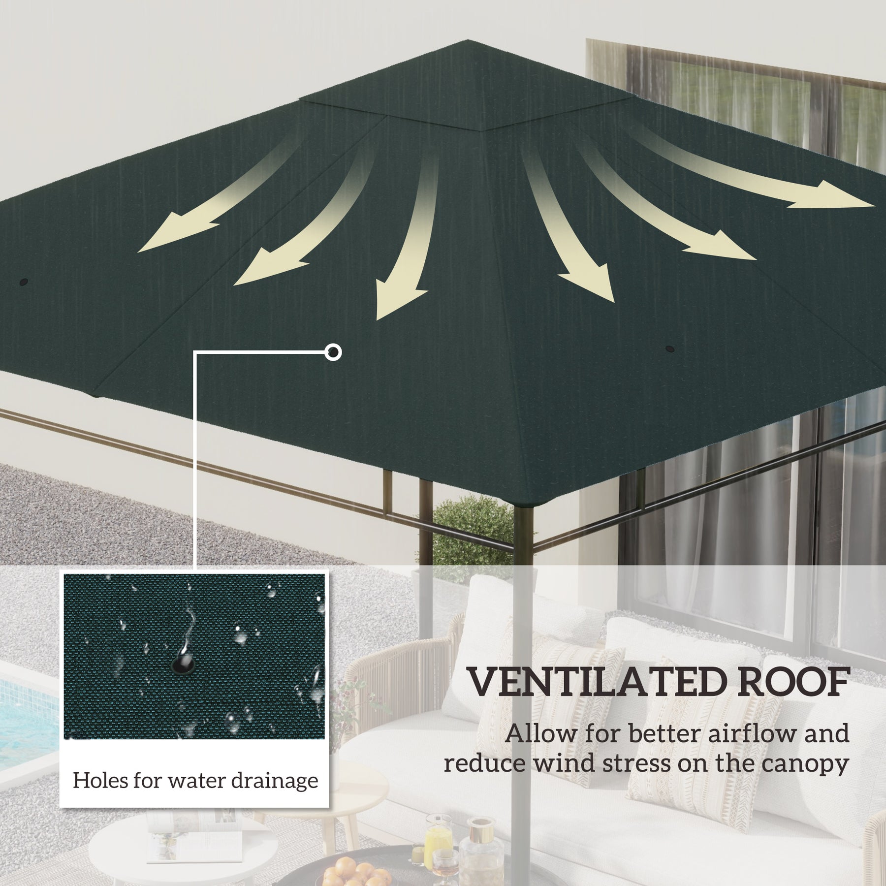 Our high quality 9.8' x 9.7' replacement canopy for gazebo provides great shade and protection from the sun. During rainy days, it is a practical shelter as used polyester cloth with PA coating which can block harmful UV rays. Breathable top with 8 water drainage holes. A cozy and pleasing get-together is provided to make your family members and friends at ease in any outdoor living area.