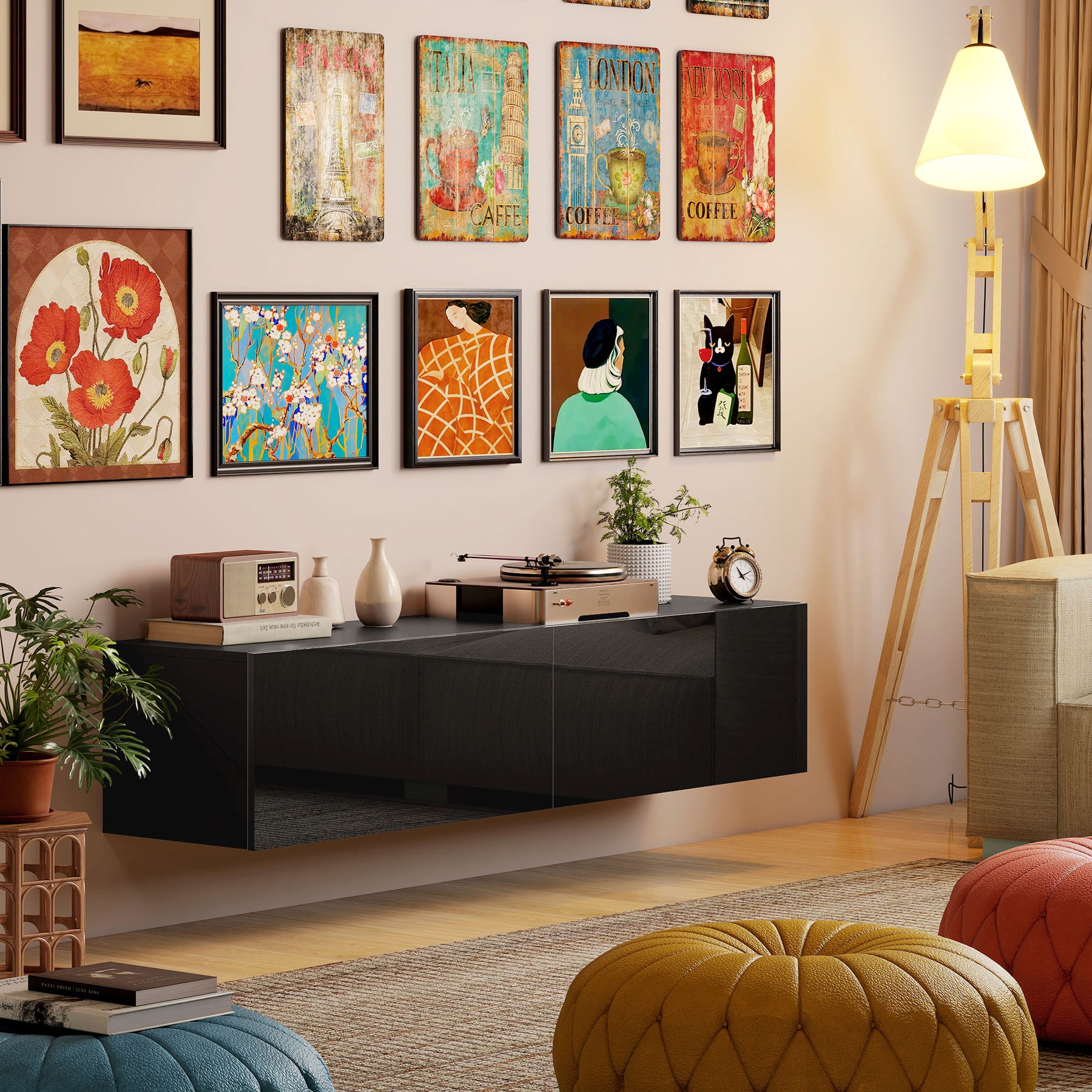 Elevate your living space with this sleek, floating TV unit. Designed to hover elegantly on your wall, it frees up floor space for your essentials while providing ample storage with its spacious tabletop and dual flip-up door cupboards. Crafted from particle board with a clean melamine finish, it's the stylish, space-saving solution your home deserves.