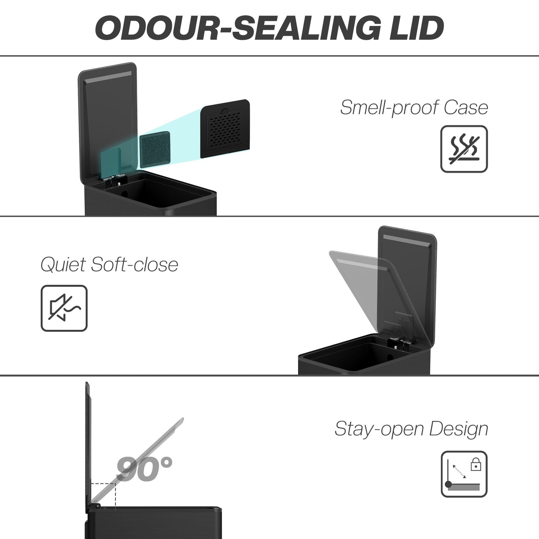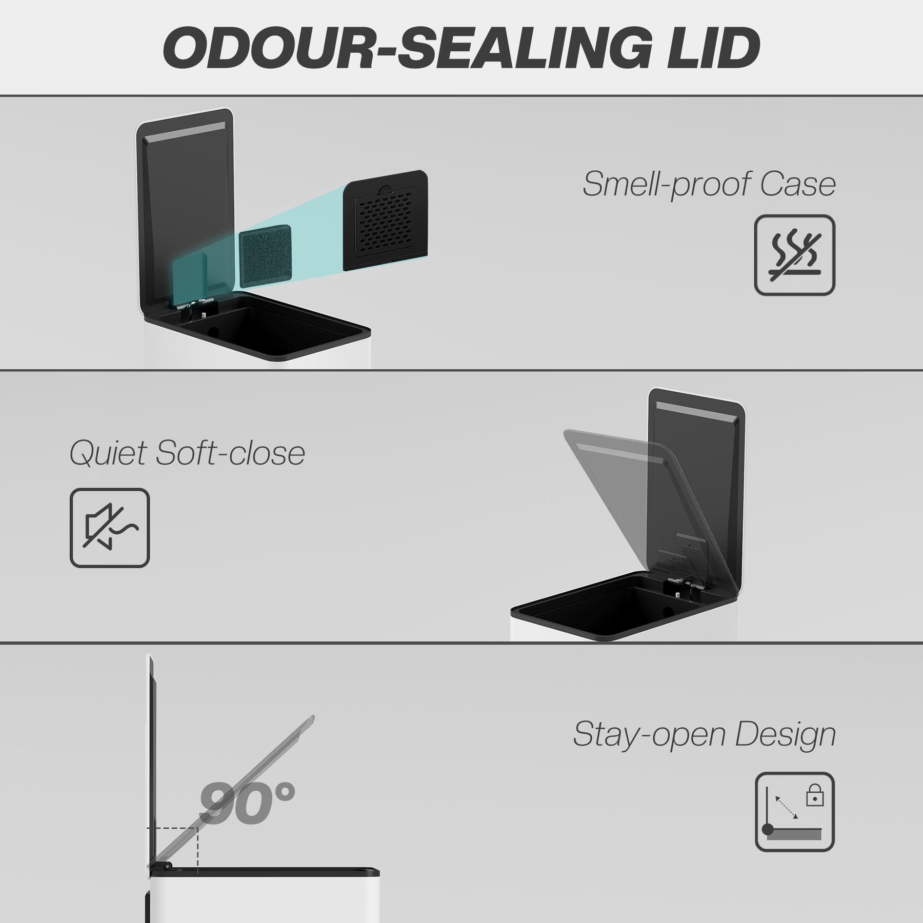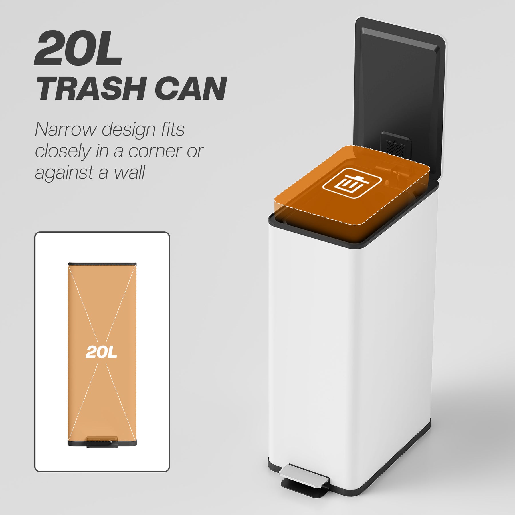 Keep your space tidy and odour-free with the HOMCOM 5.3 gal (20L) kitchen garbage can! This bin has a soft-close, stay-open lid and a smell-proof compartment, keeping your kitchen fresh and organized. Crafted from fingerprint-proof stainless steel, its stylish design enhances modern decor. A handy foot pedal and removable inner bucket make waste disposal convenient and easy to clean. This trash can provides a great blend of functionality and modern style for your home.