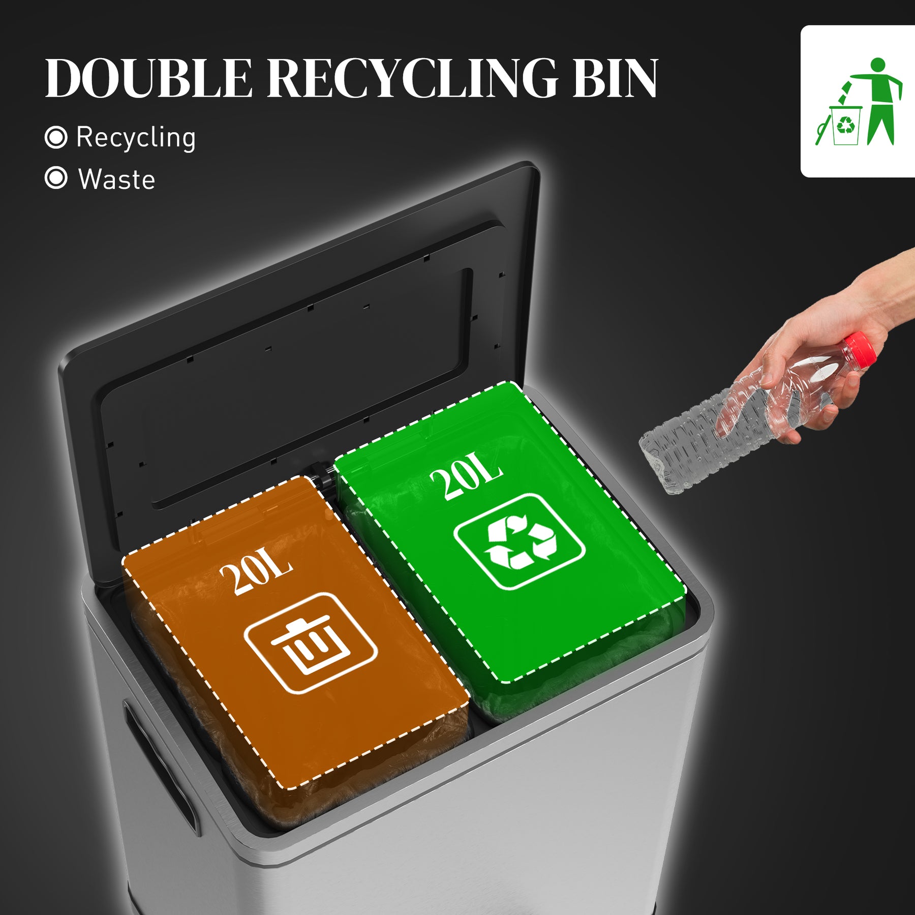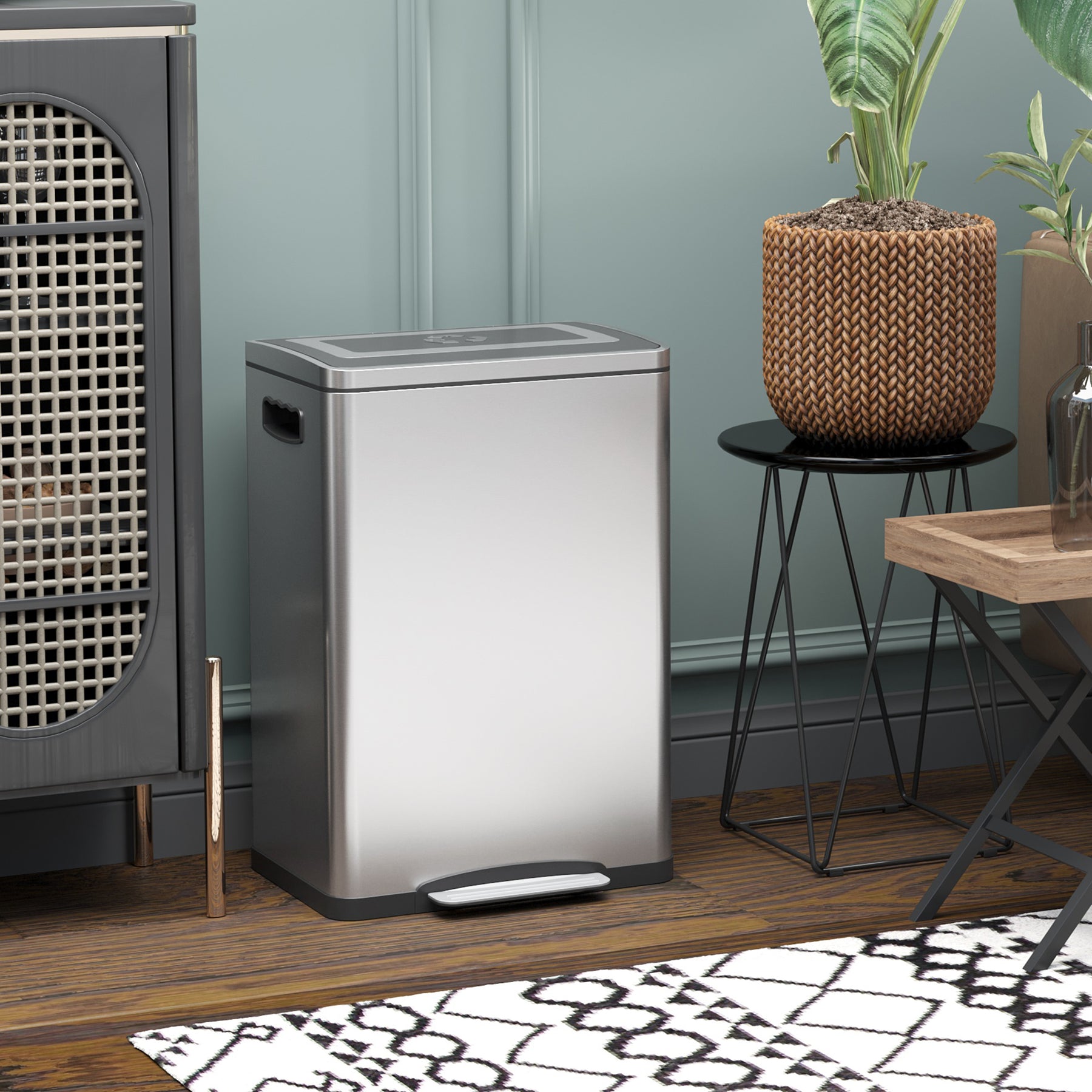 Keep your space tidy and chic with the HOMCOM Trash Can. This garbage can with a lid features two 5.3-gallon (20L) compartments for easy waste separation and a fingerprint-proof stainless steel finish. The soft-close lid and foot pedal offer a silent and sanitary operation, making it an elegant under-sink garbage can solution. Enjoy a cleaner kitchen with this stylish trash can!