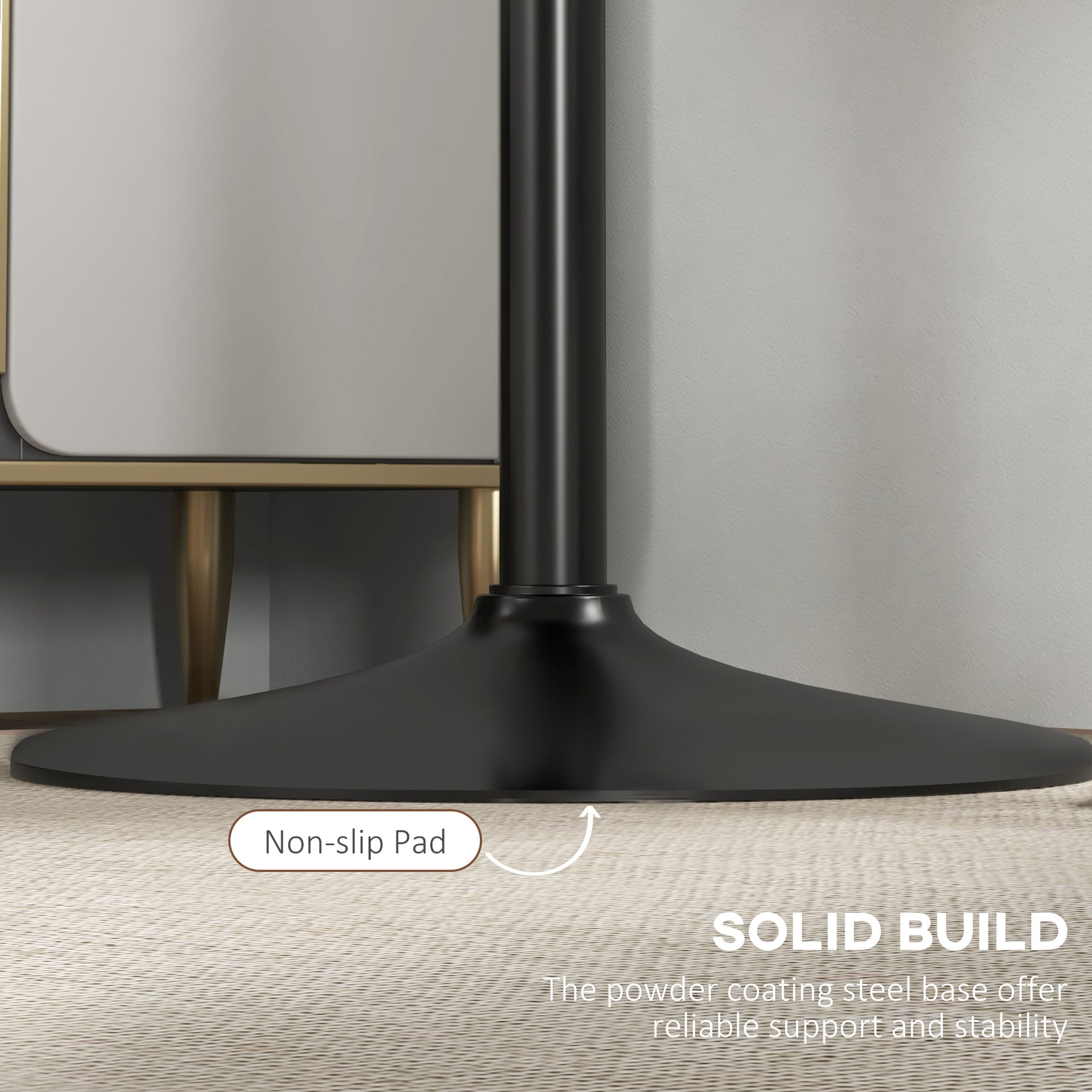 - • Large and round base, made from powder-coated steel for strength