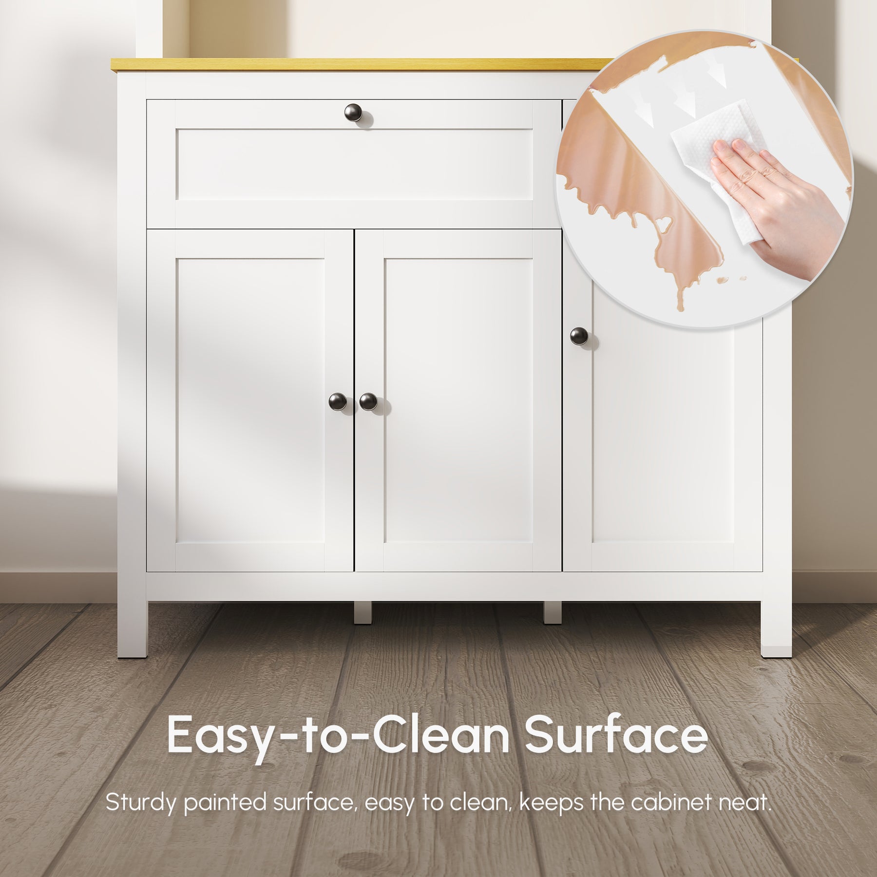 - • Door cabinets and open shelf give you lots of storage space