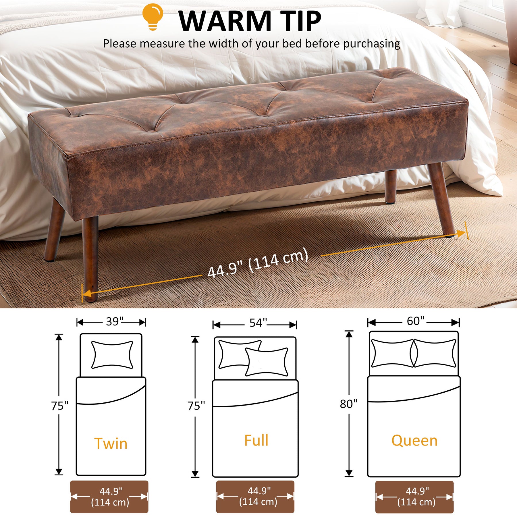 - • Retro style bench with button tufted design for decoration, fit perfectly with double bed