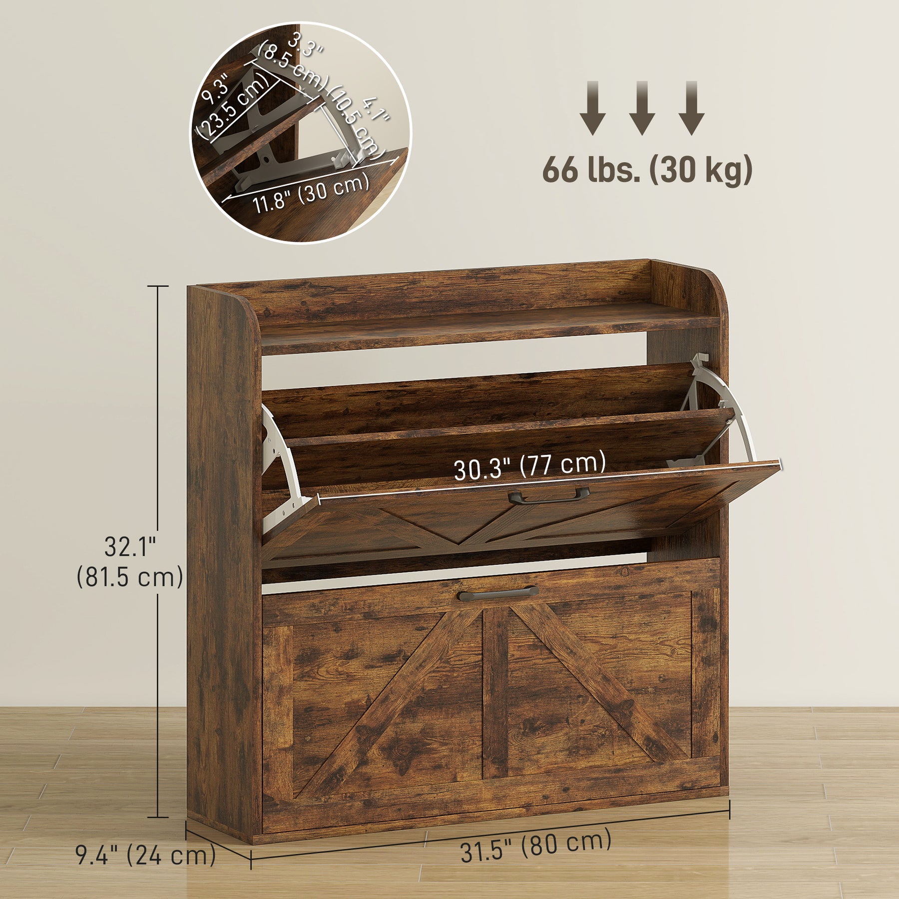 Discover the charm of a farmhouse shoe cabinet with barn doors from HOMCOM. With two two-tier flip drawers, this slim shoe cabinet smartly organizes up to 16 pairs of shoes. Adjustable dividers cater to different shoe types, or simply remove them to accommodate larger shoe sizes. What's more, the tabletop of shoe organizer cabinet with raised sides is great for displaying decor or keeping daily essentials handy, merging functionality with flair for your entryway.