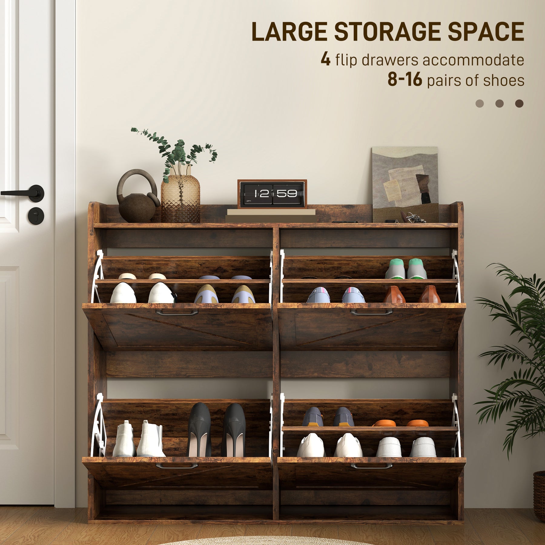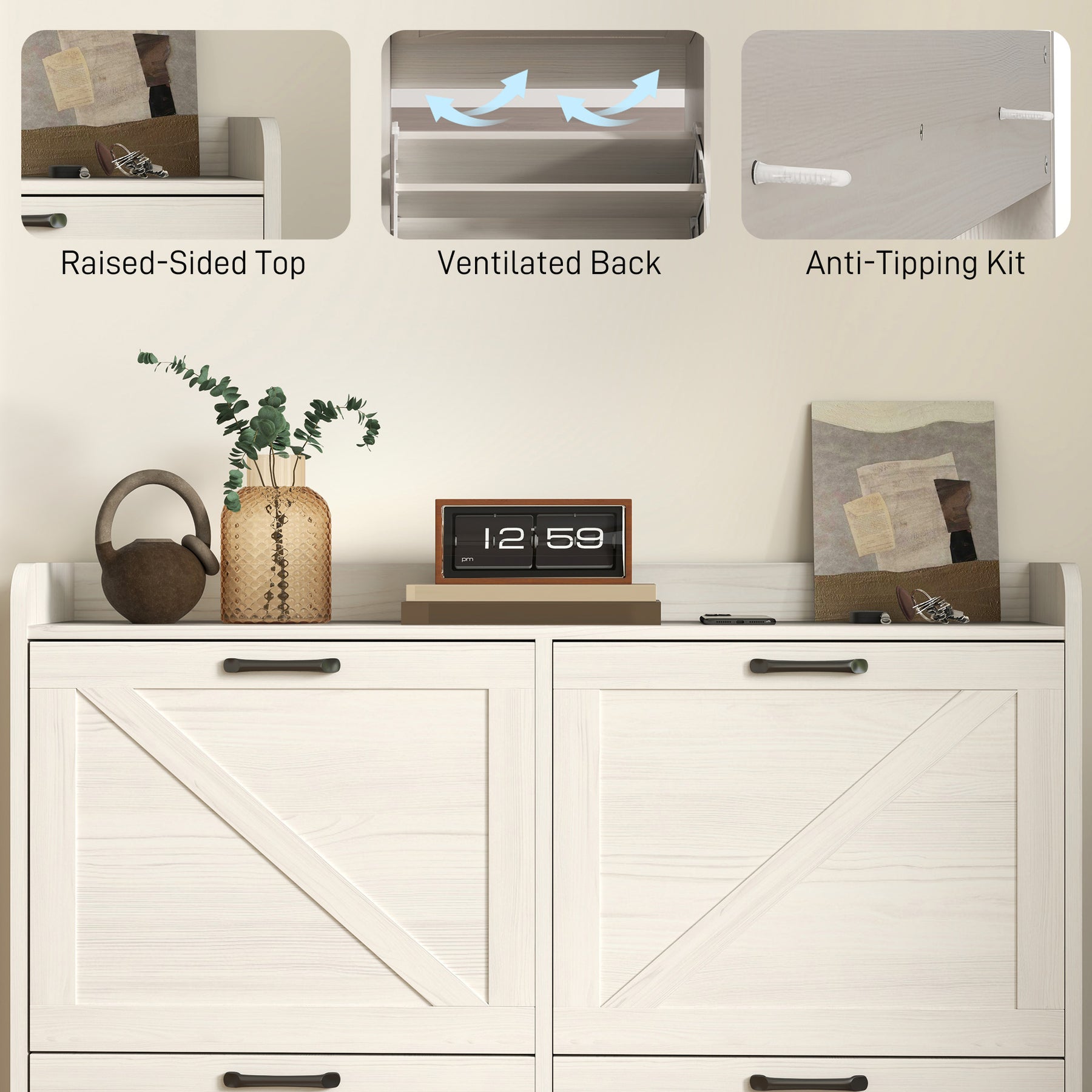 Discover the charm of a farmhouse shoe cabinet with barn doors from HOMCOM. With four two-tier flip drawers, this slim shoe cabinet smartly organizes up to 16 pairs of shoes. Adjustable dividers cater to different shoe types, or simply remove them to accommodate larger shoe sizes. What's more, the tabletop of shoe organizer cabinet with raised sides is great for displaying decor or keeping daily essentials handy, merging functionality with flair for your entryway.