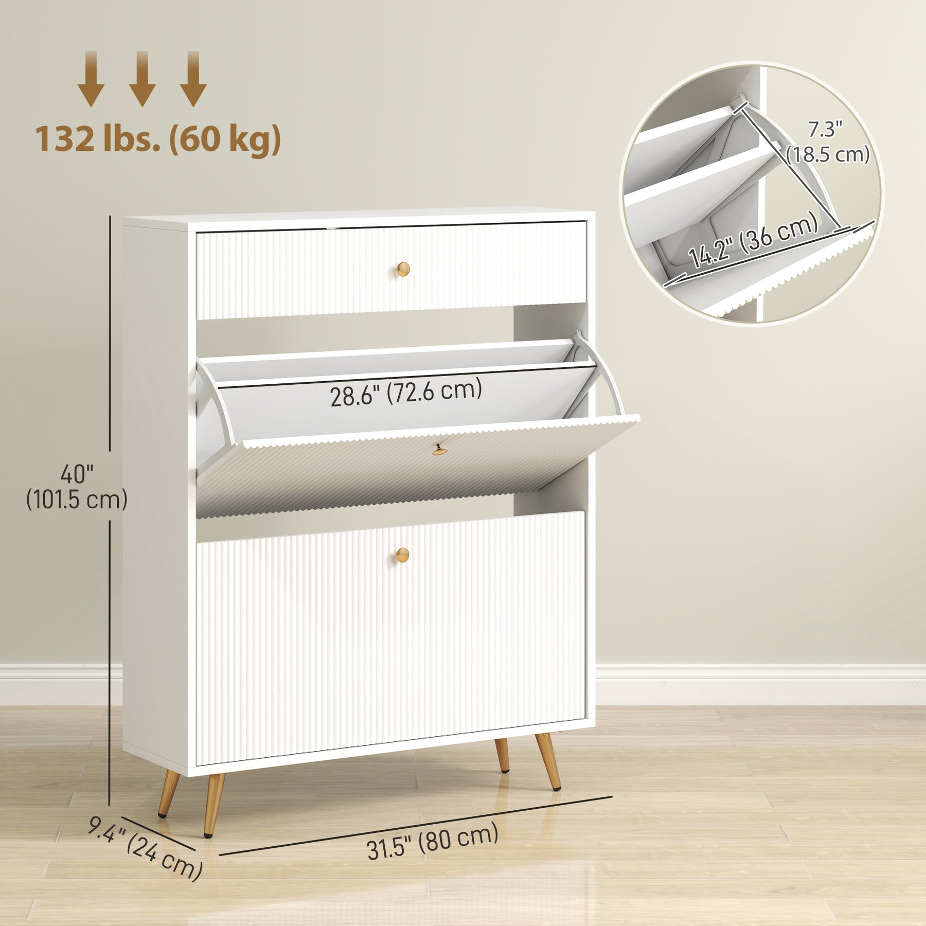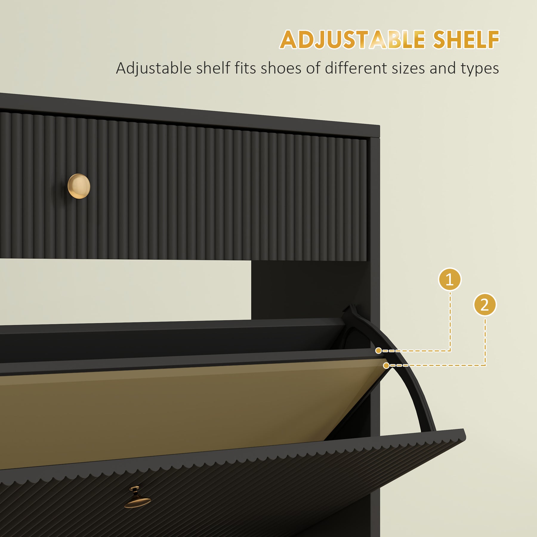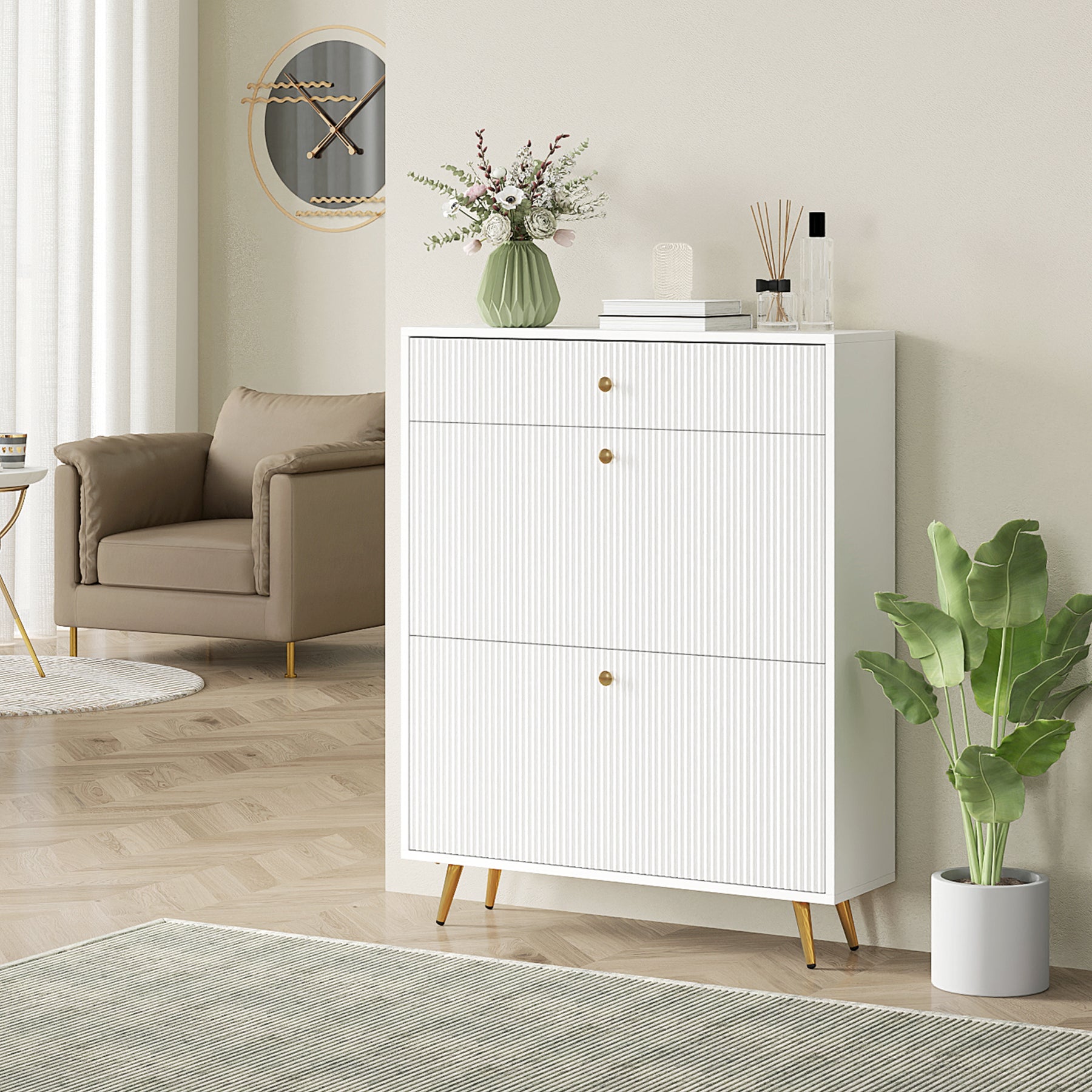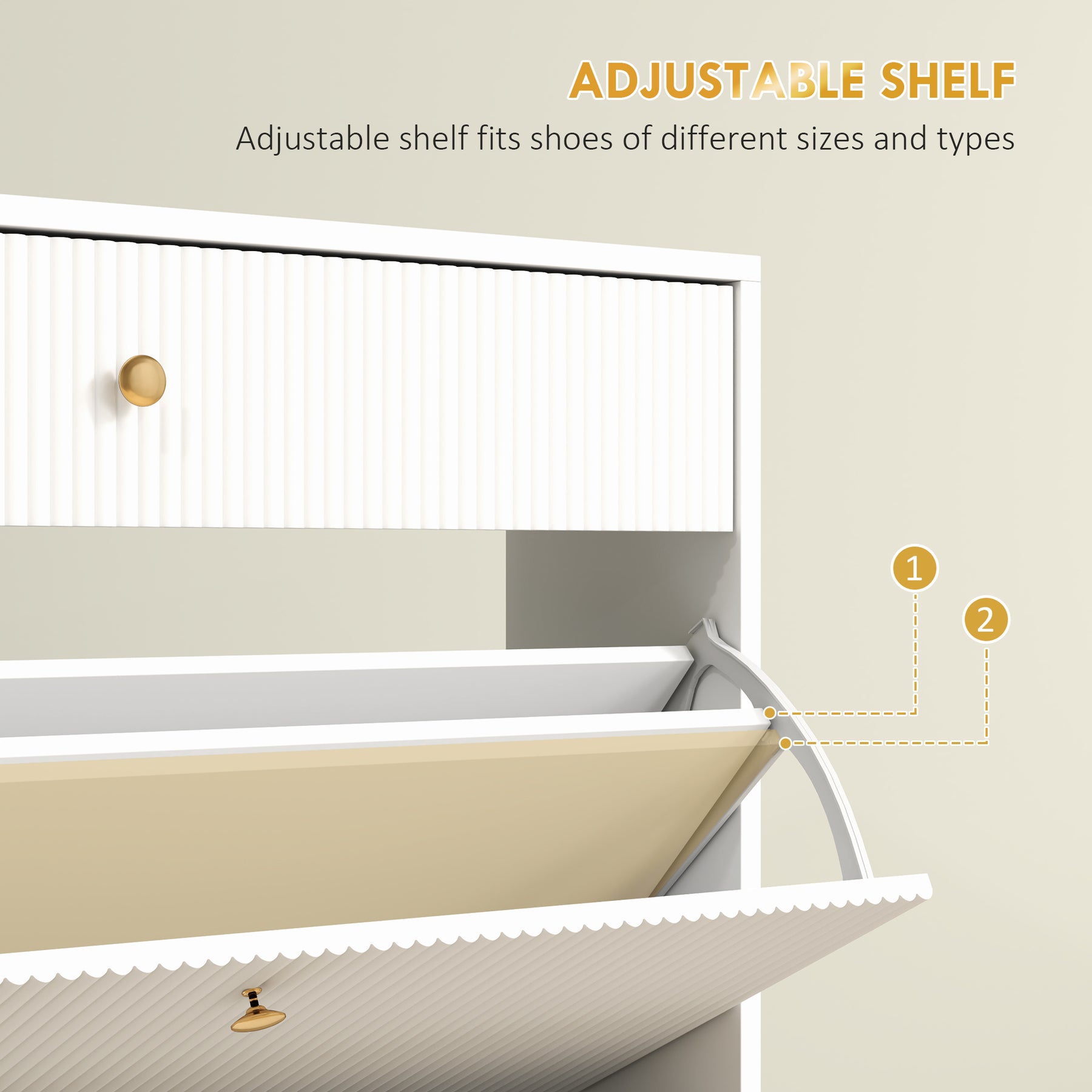 Transform your entryway with the stylish HOMCOM entryway cabinet! This slim shoe cabinet features solid colour finishes and wave-like fluted panels with chic gold handles, adding a modern touch to your space. Its two flip drawers neatly store up to 12 pairs of shoes, while a small drawer keeps essentials at hand, making it a great shoe rack cabinet for any home.