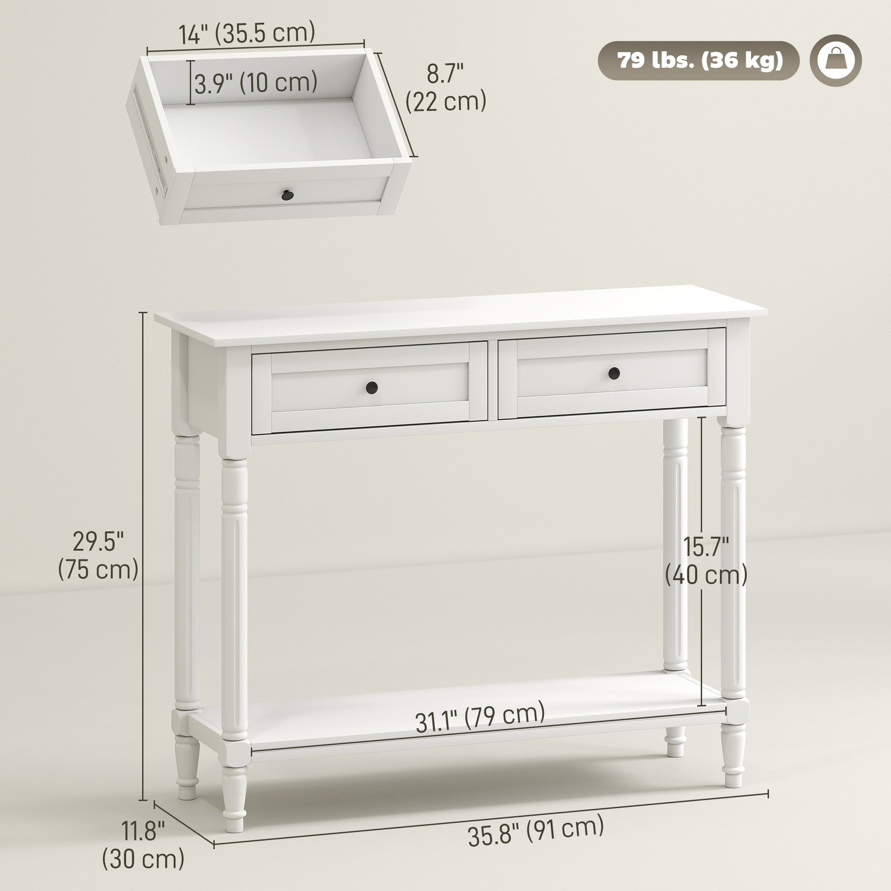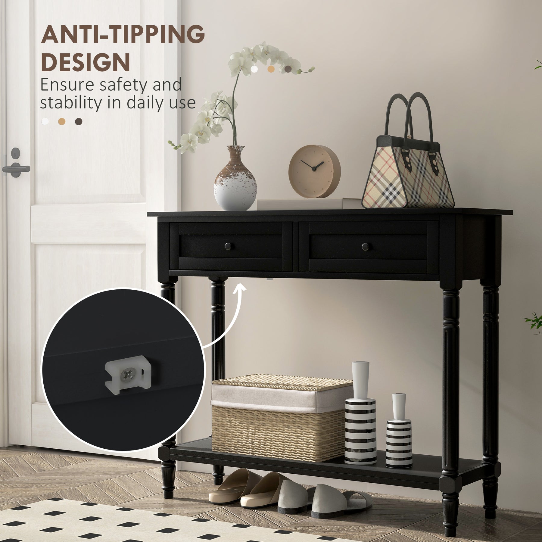 Elevate your space with the elegant console table from HOMCOM. This versatile piece doubles as a behind sofa table or an entry table, offering a spacious tabletop, two handy drawers, and a lower shelf for all your storage needs. Stylish and functional, it's the great addition to your hallway, living room, or bedroom.