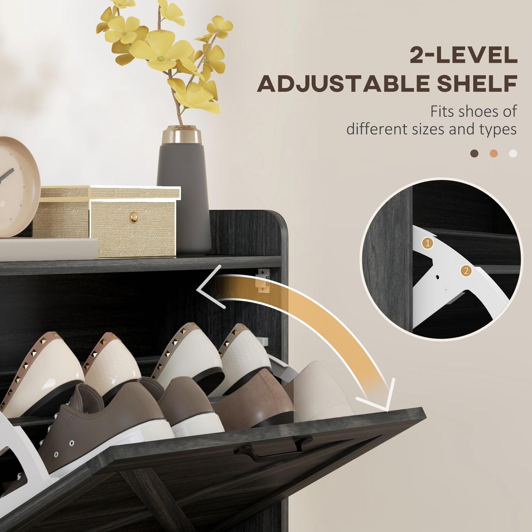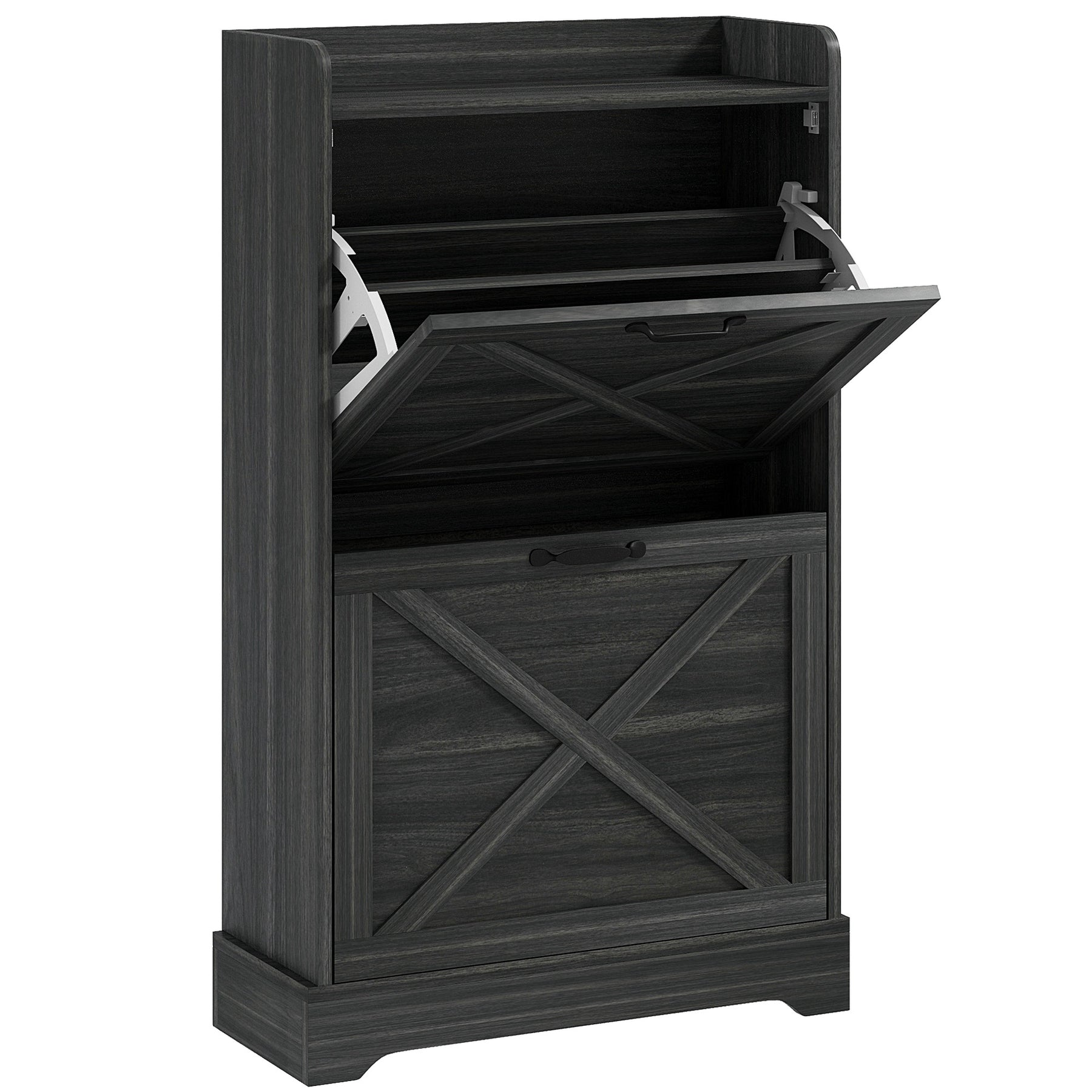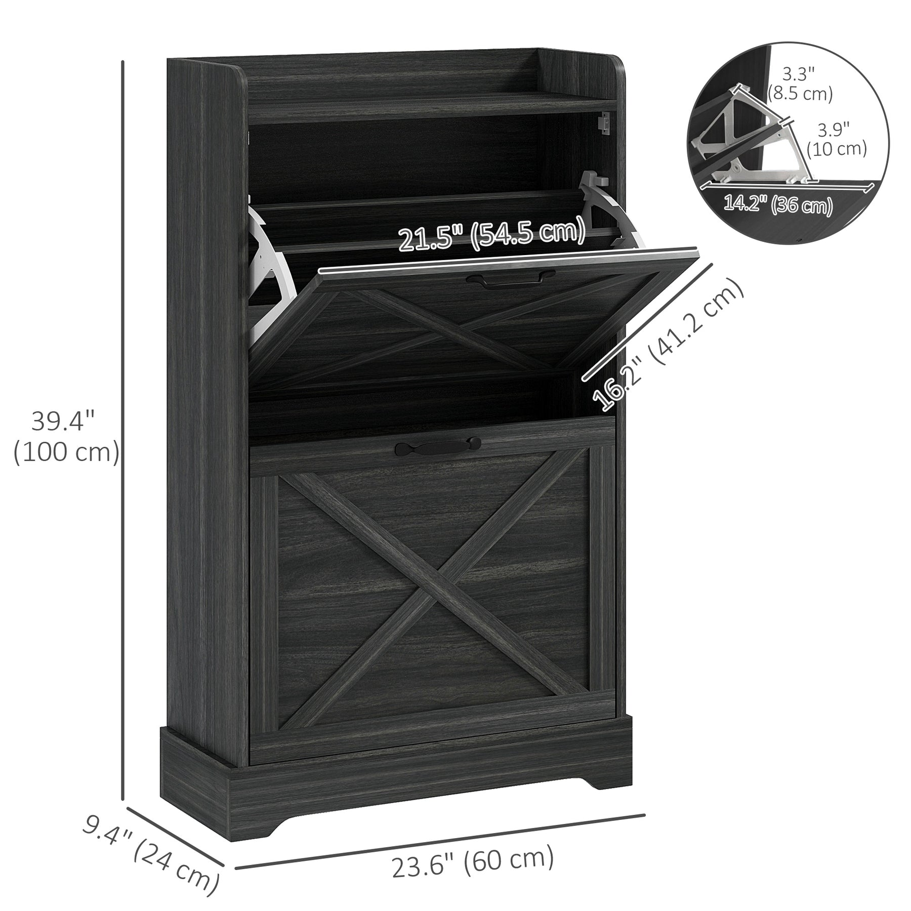 Revamp your hallway with the shoe storage cabinet from HOMCOM. Featuring a stylish wood grain body and barn-style panels, this shoes cabinet is a true statement piece. Two flip drawers with adjustable shelves, it offers lots of shoe storage for up to 8 pairs of max. size CA 12, making it a practical and fashionable entryway shoe cabinet.