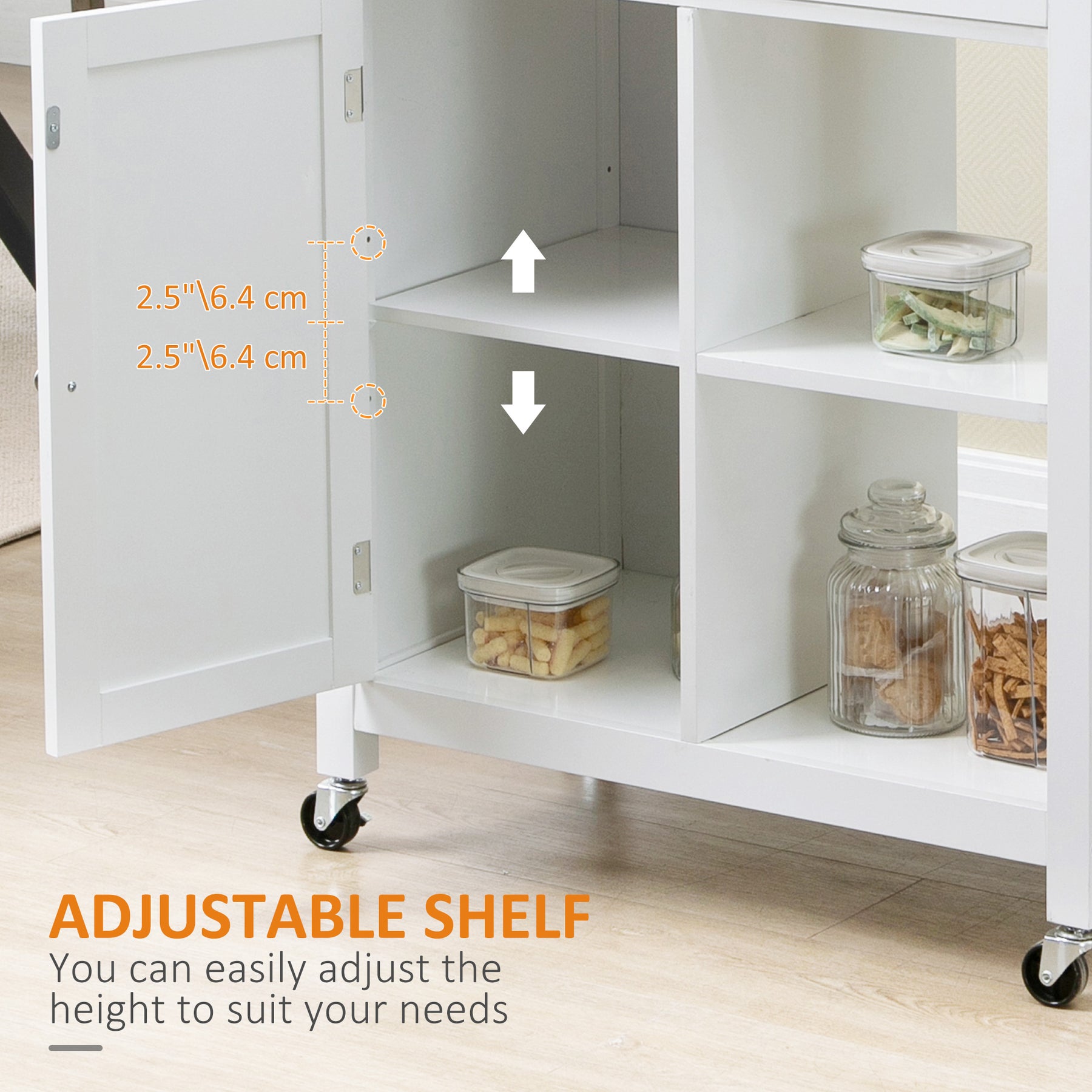 Make your home parties more convenient with this versatile kitchen cart on wheels. With its easy mobility, you can move it from room to room effortlessly. It features a practical drawer, a concealed cabinet, a 2-tier open shelf, and a towel rack, providing sufficient storage for your kitchen and dining essentials. Add this portable kitchen island to your kitchen space for a functional and stylish helper.