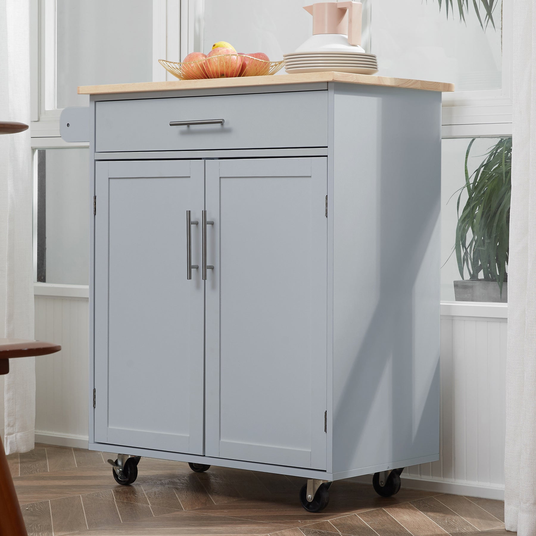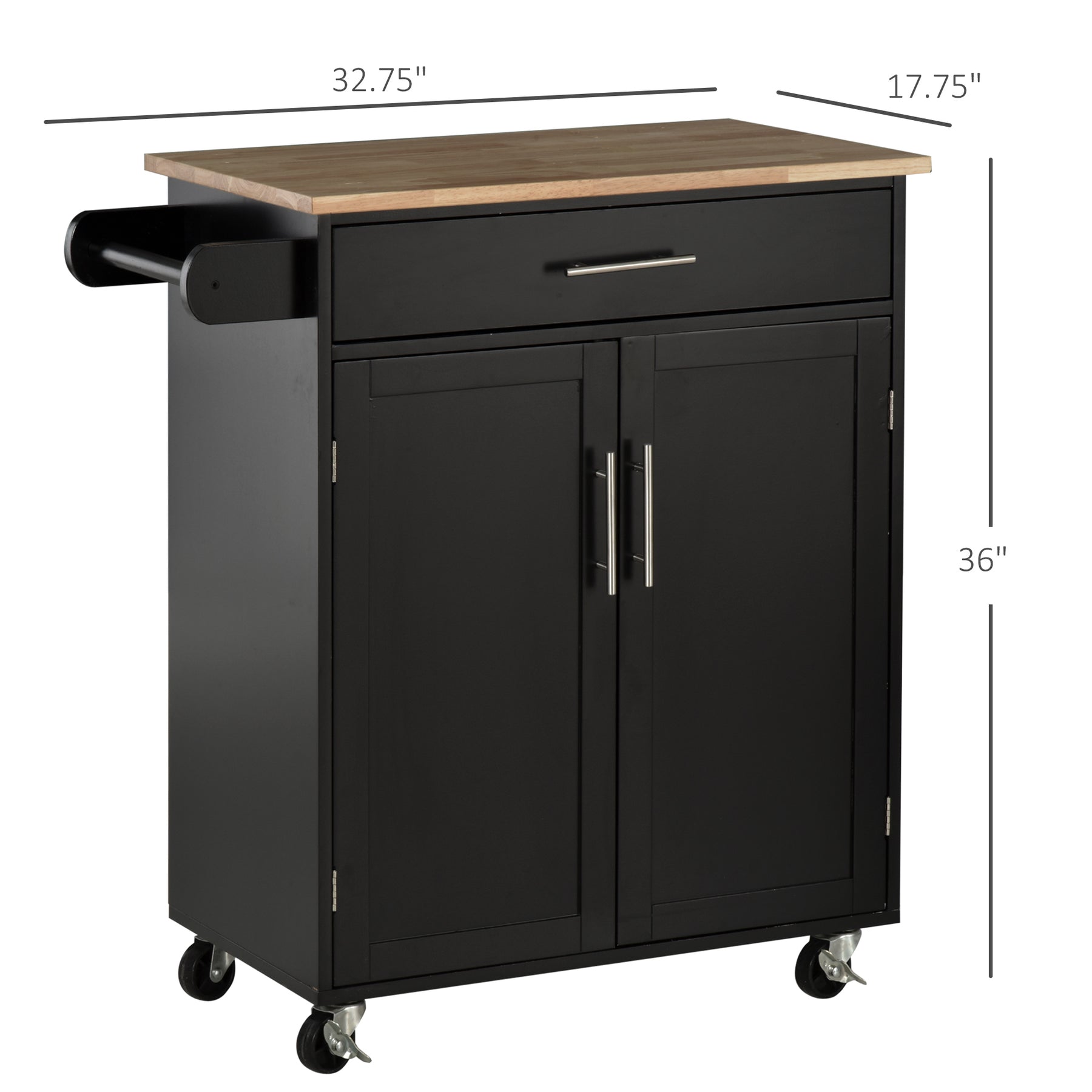 Win your kitchen back from clutter with HOMCOM rolling cart. With a large rubberwood countertop, you can effortlessly increase the work area of your space without sacrificing style. Our kitchen island with storage provides tons of additional storage space too. With a large drawer and plenty of cabinet space underneath the countertop, you can store dishes, bowls, cookware, and kitchen essentials away from other cramped storage areas.