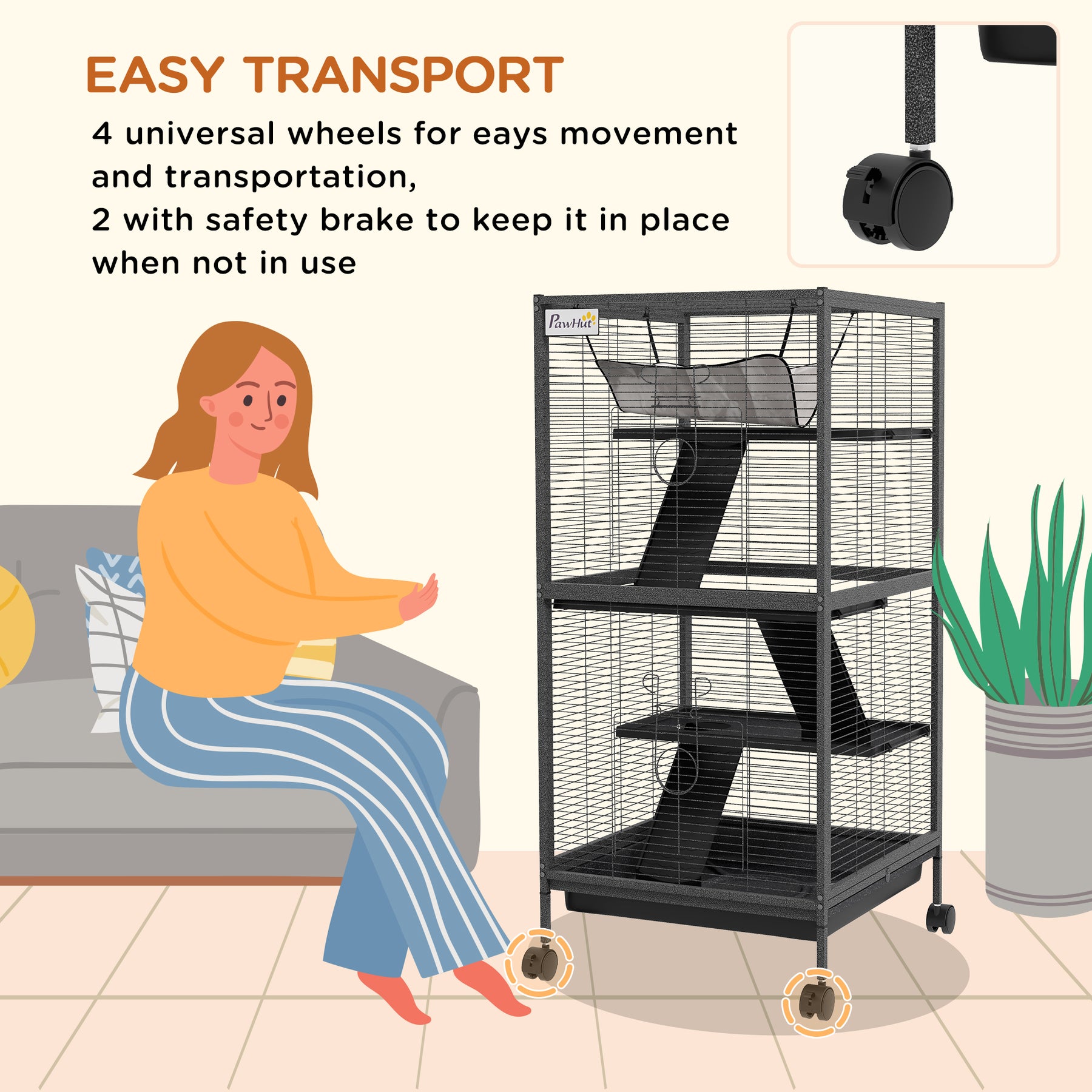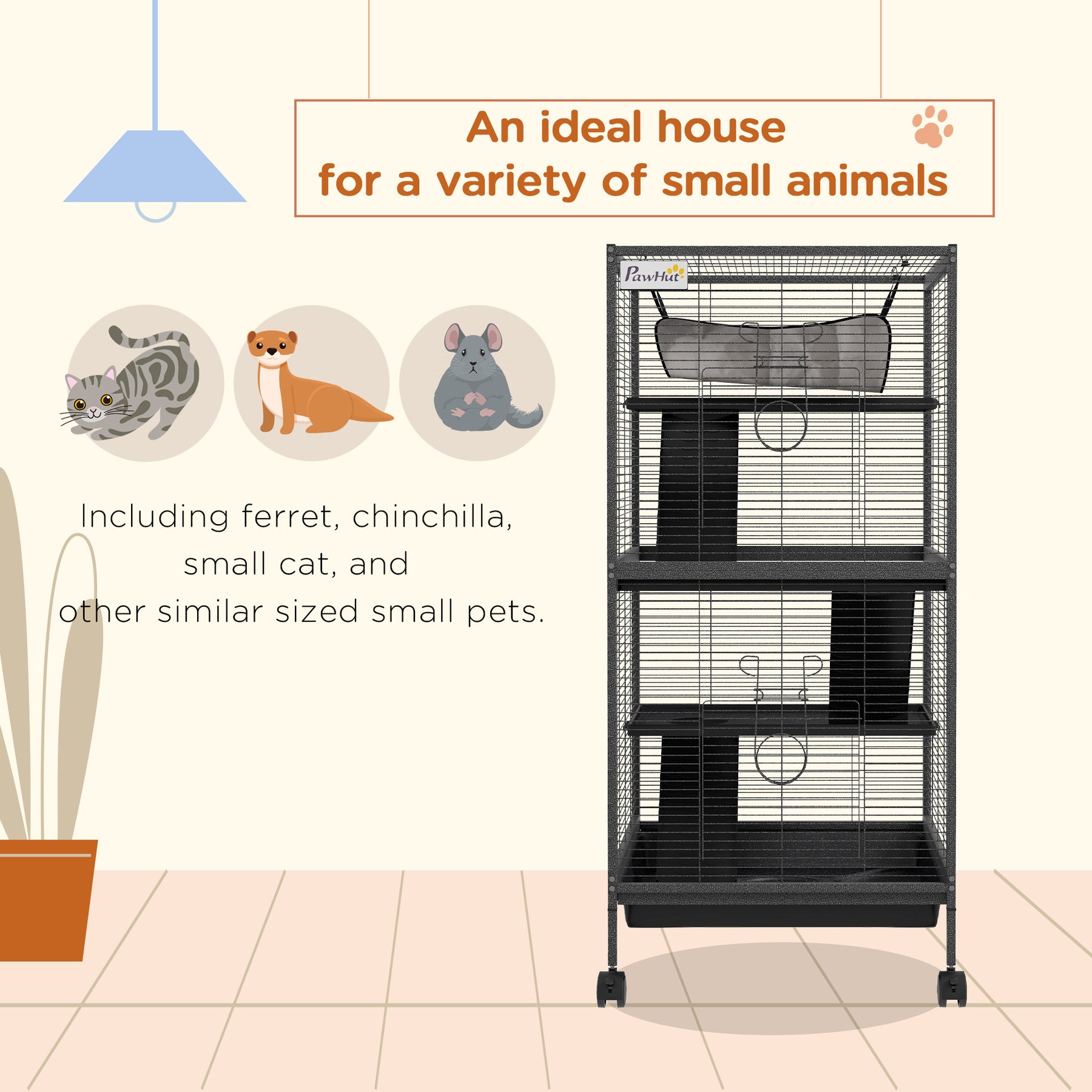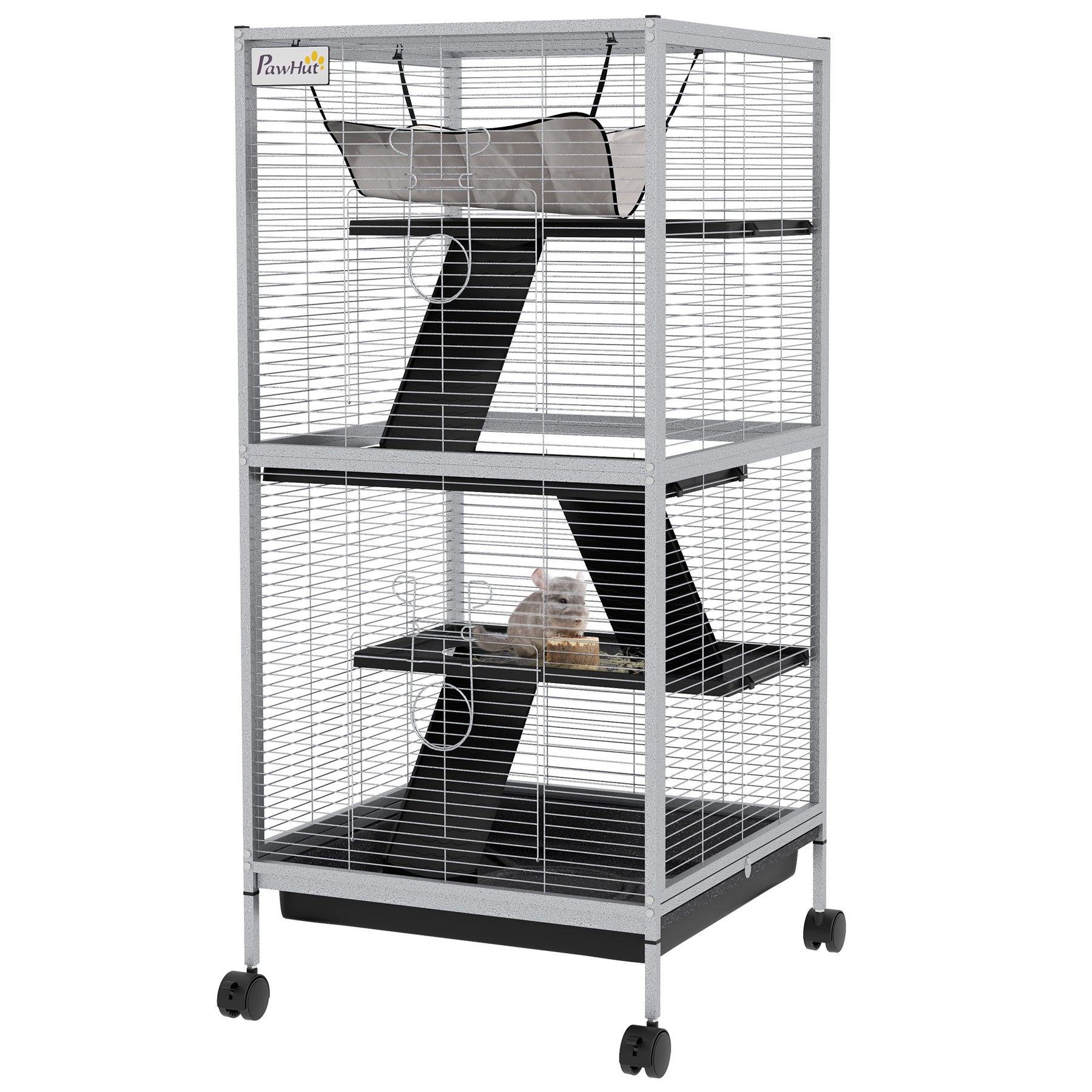 PawHut small animal Cage is the perfect home for small animals like chinchilla, small cat and other similar sized small pets. It features 4 wheels for easy moving from room to room and also provides a bit more height for your pet's view. The durable design features 2 large doors for easy access to your pet. A removable tray for easy cleaning up. Features ramp and platform to complete this cage.Keep them safe, keep them secure, but also keep them active and occupied for a long life worth living.