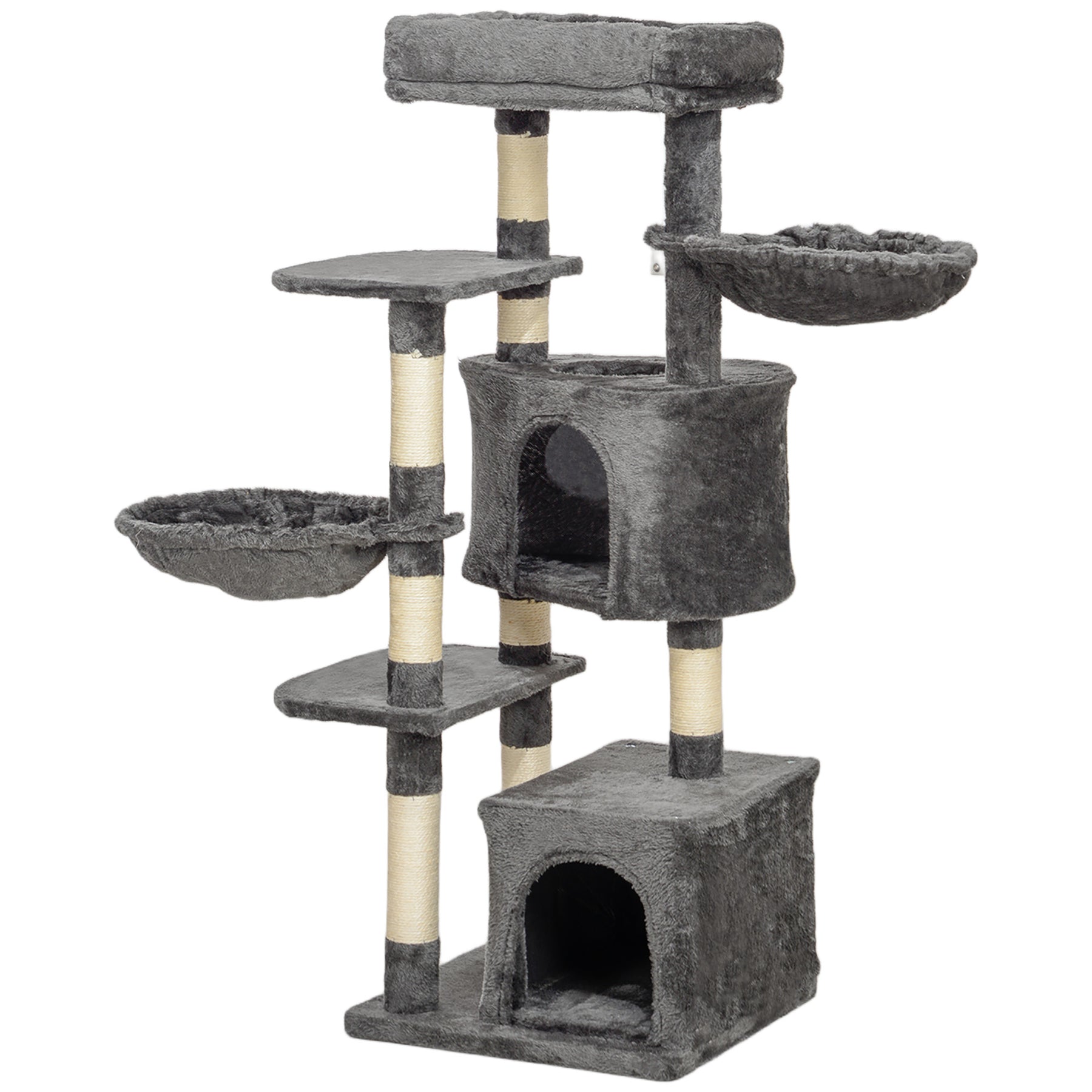 Transform your home into a feline paradise with the PawHut Cat Tree! Featuring scratching posts for indoor cats, a cozy cat bed, and dual condos, this plush-covered cat tower invites endless fun. Two hammocks and platforms let your furry friends lounge and play in style, making it a excellent blend of comfort and play for cats up to 13 lbs. (6 kg).