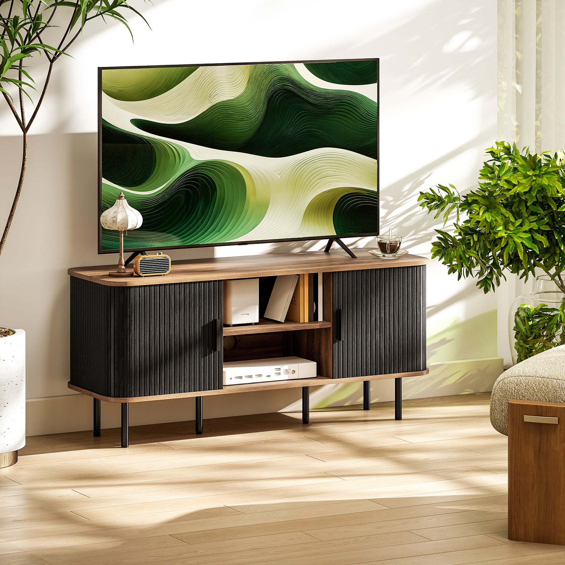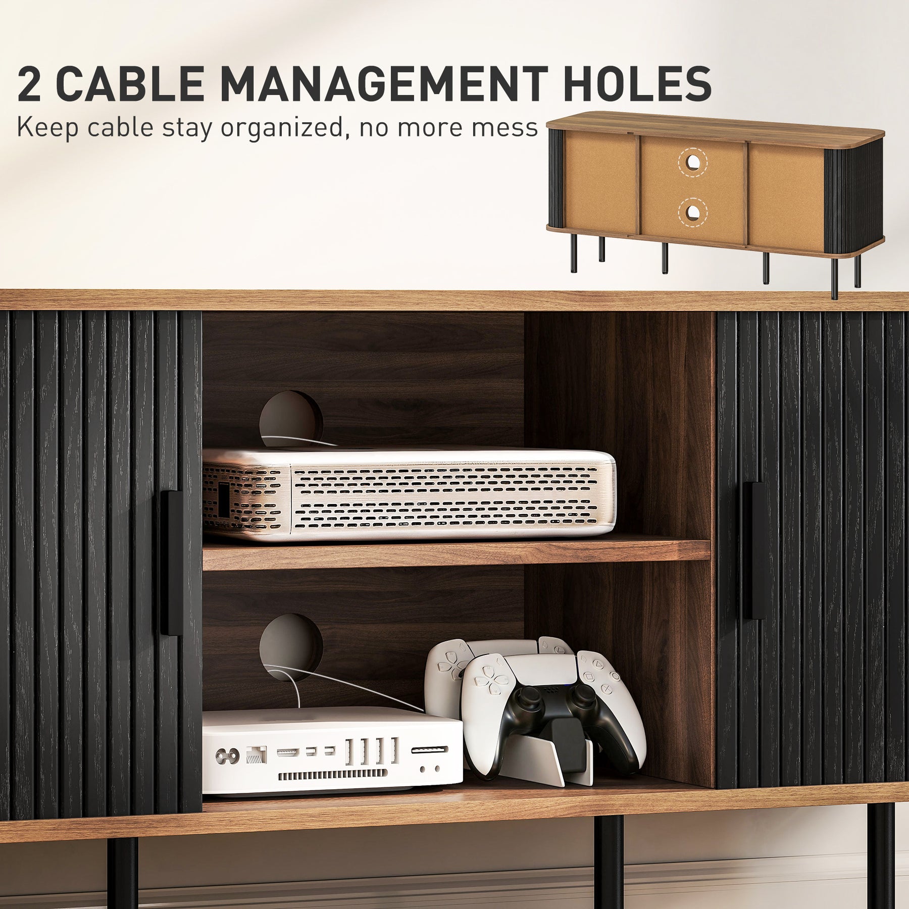 Upgrade your living room with this HOMCOM TV table stand for a 55-inch TV. This TV console table with storage does more than hold your TV; it features two open shelves and two cabinets with a slatted tambour-style door to provide ample storage space for your favourite movies, a collection of video games, or books you love to read. There are two cable holes for organizing wires without a mess. Without a doubt, it will be a great companion for your relaxing moments.
