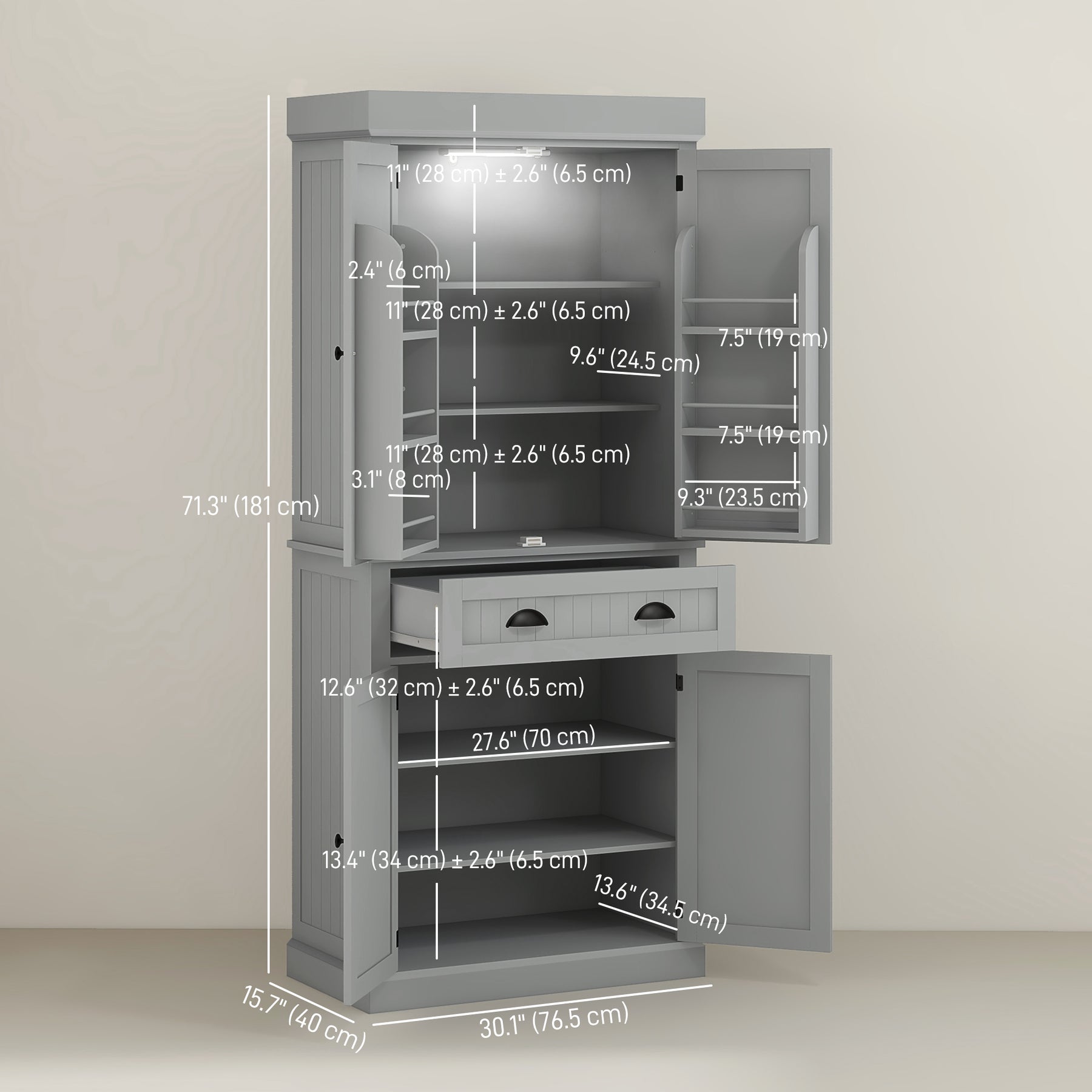 Light up your kitchen organization with the HOMCOM storage cabinet with doors and shelves! Featuring adjustable LED lights with motion and light sensors, this tall cabinet offers customizable illumination. Enjoy ample storage with a drawer, four adjustable shelves, and six side door racks, all secured with magnetic locks for seamless access. Transform your kitchen storage into a well-lit, functional space!