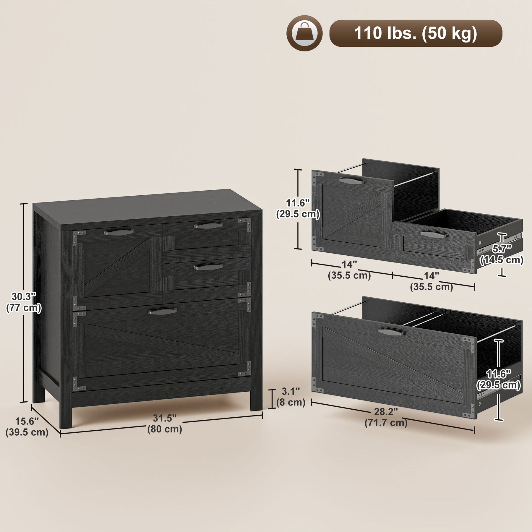 Bring order and style to your workspace with this farmhouse-style file cabinet from HOMCOM. Featuring a mix of drawer sizes, it keeps documents and office supplies neatly organized, while silent drawer slides ensure smooth, quiet use. The thick tabletop offers a strong surface for a printer, scanner, or your favorite decor. With barn-style detailing, matte black handles, and metal accents, the lateral filing cabinet adds rustic charm and standout style to any home office setting.