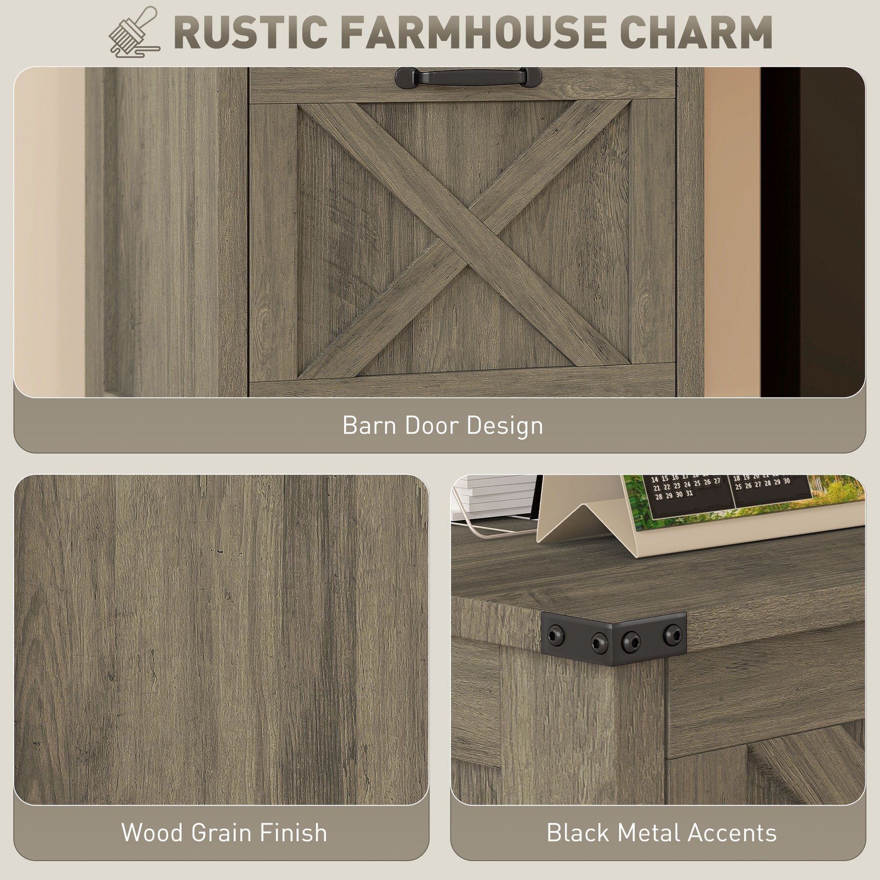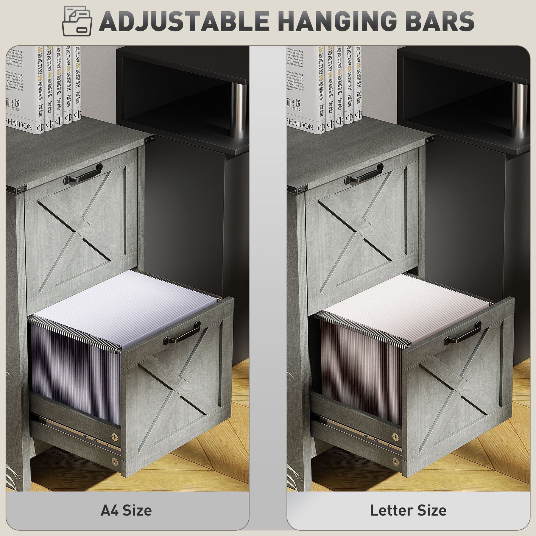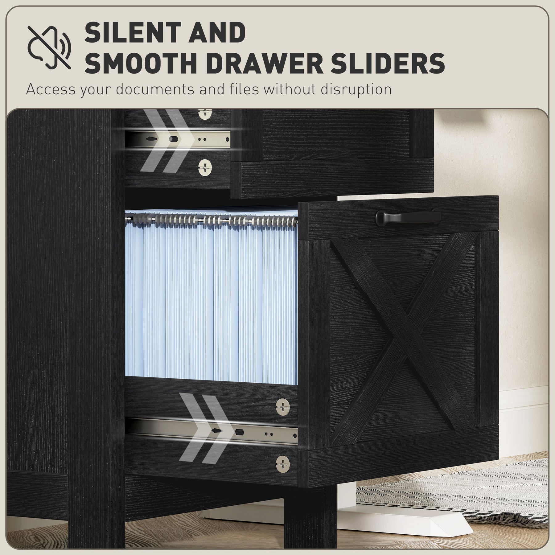 Elevate your workspace with the rustic farmhouse 2 drawer filing cabinet from HOMCOM. It features a charming barn door design paired with a distressed wood finish and sleek black metal accents. 2 spacious file drawers provide abundant storage for all your office supplies and important documents. Whether tidying up your office supplies or securely storing critical papers, this HOMCOM file cabinet is an excellent choice to enhance both organization and style in your workplace.