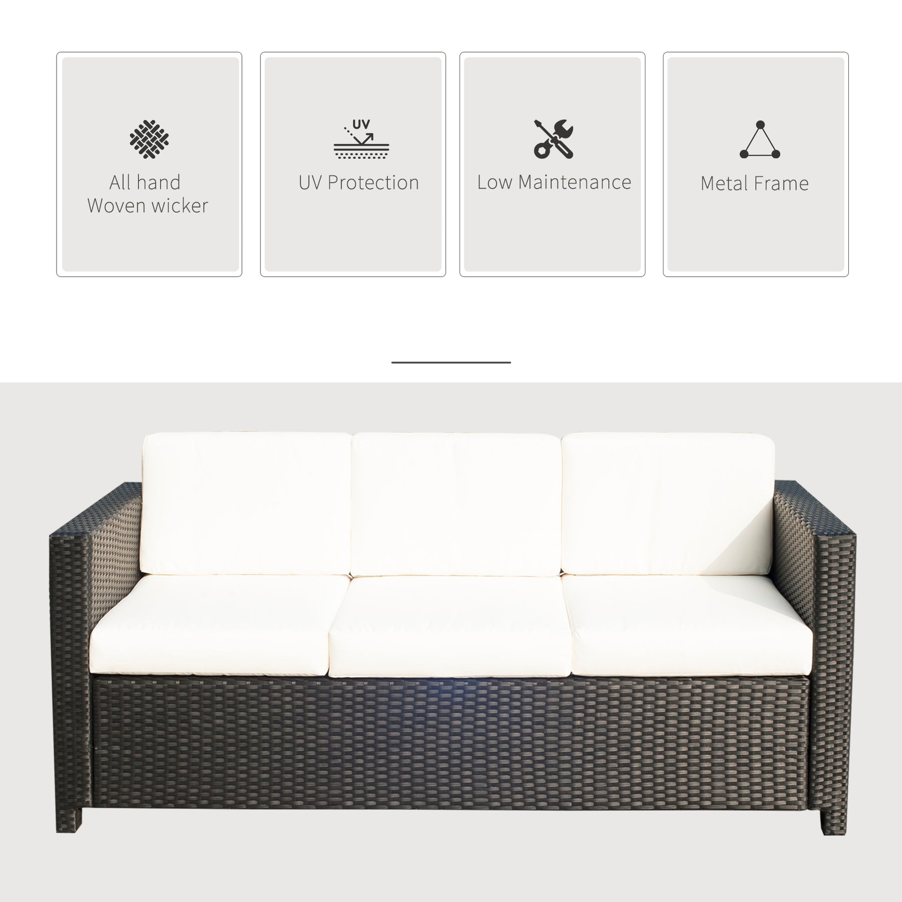 This high-quality and comfortable 3 seat rattan sofa is great for relaxing with friends and families while reading books or having a cup of coffee. It is built of solid steel pipe and robust PE rattan designed for long lasting indoor and outdoor use. It equipped with padded cushions for extra comfort. Washable cushion cover with No.5 zipper for easy opening and close. It is wide enough for 3 people to sit on, suitable for both indoor and outdoor use.