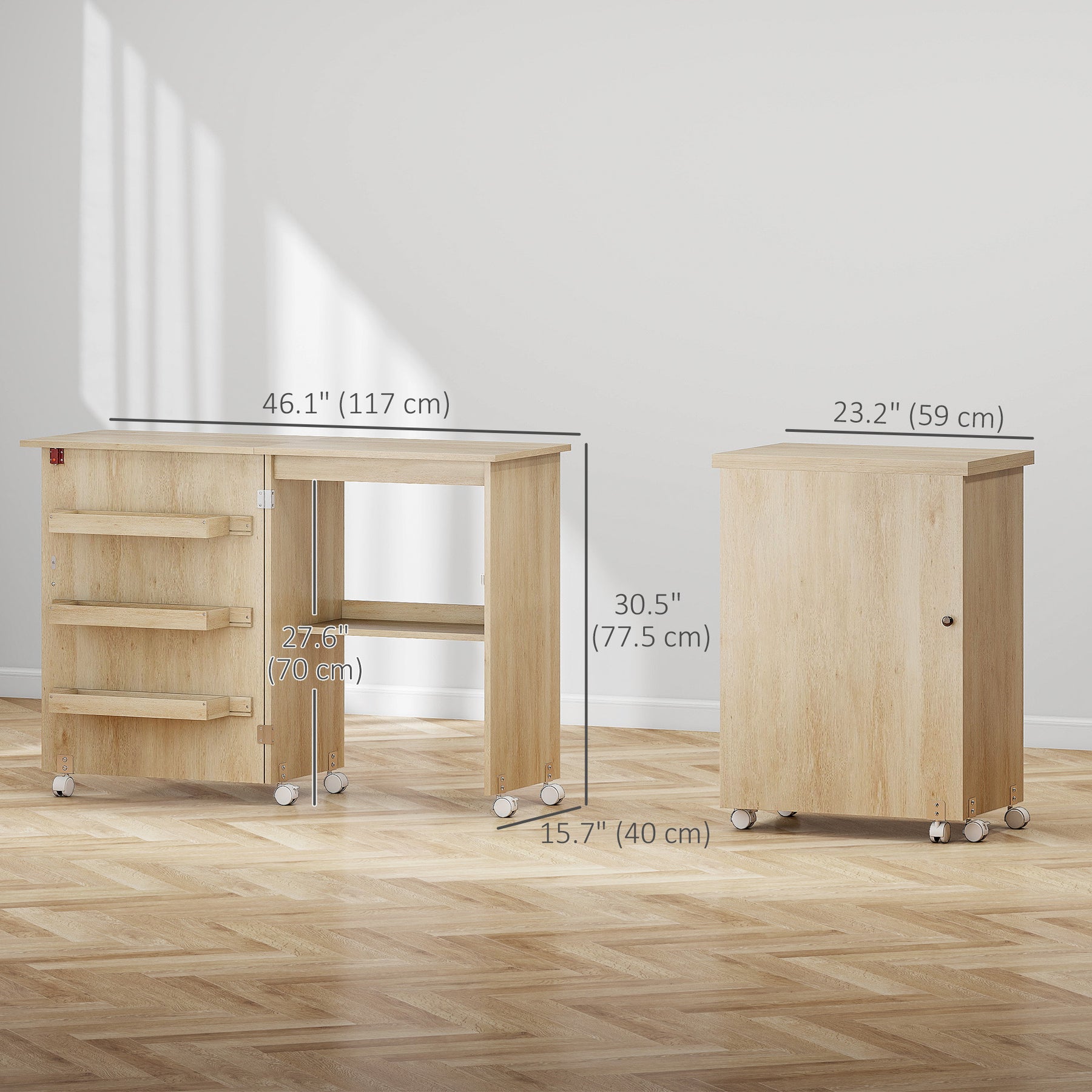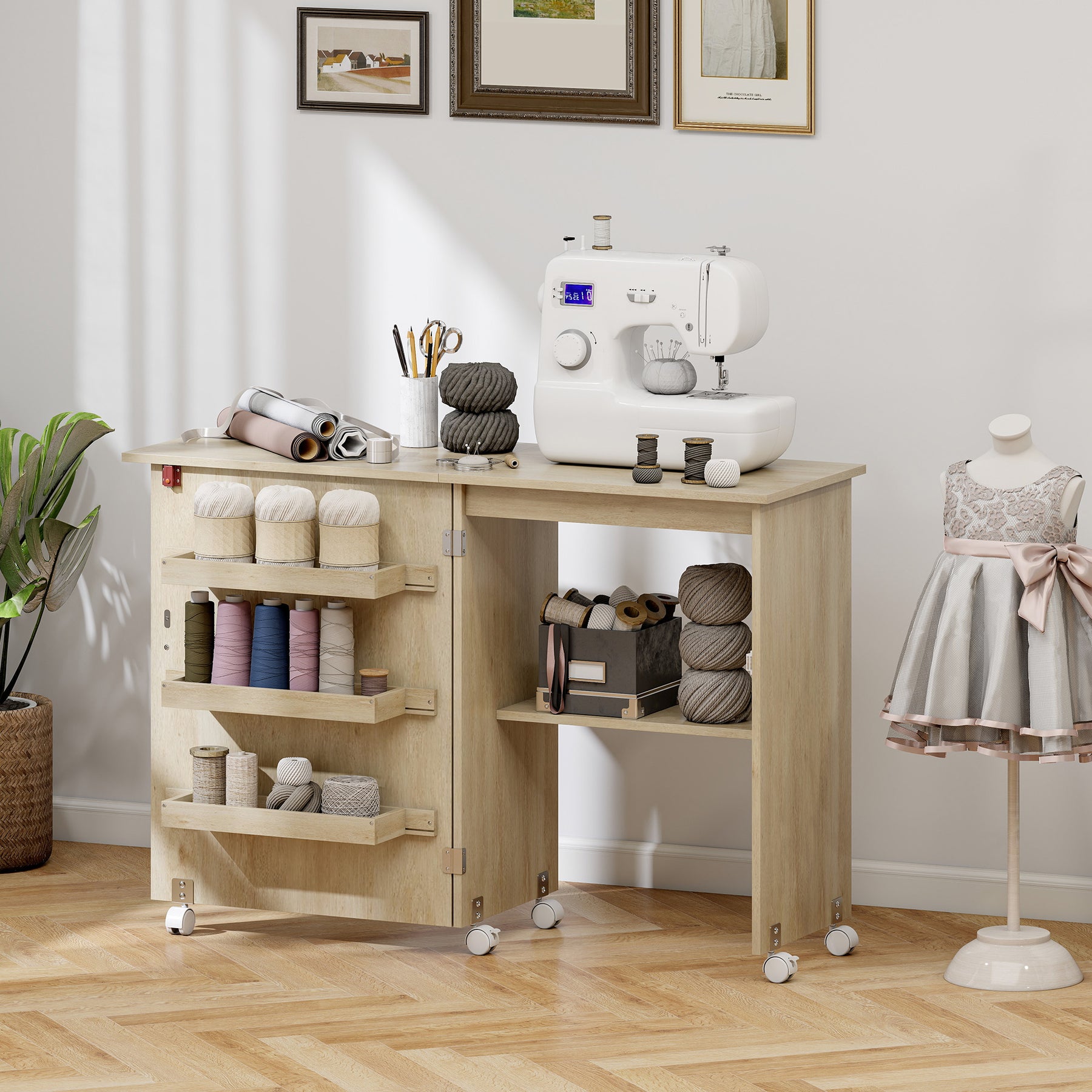 Transform your crafting with the folding sewing table for sewing machine from HOMCOM, a versatile sewing desk that expands with a drop leaf top and magnetic side for a spacious craft table. Tuck it away as a side cabinet when space is limited. Our sewing desk features lots of storage with three bins and an under-desk shelf, all set on five wheels for easy mobility. Suitable for any sewing enthusiast or as a dynamic crafting table.