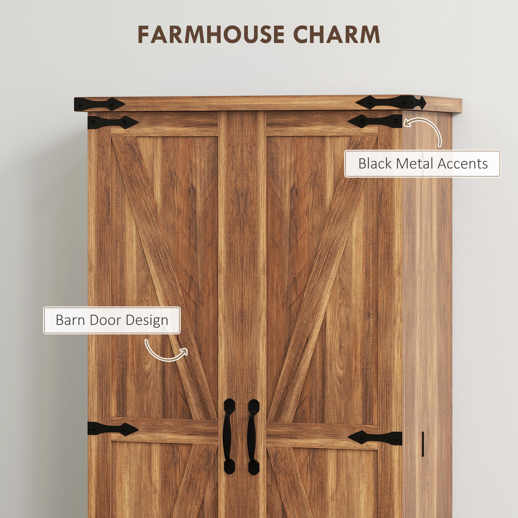 Elevate your kitchen space with the pantry cabinet from HOMCOM. This farmhouse-style kitchen pantry features a charming barn door design with black metal accents and ample storage, transforming clutter into stylish organization. Organize effortlessly through a five-tier cabinet with adjustable shelves for flexible storage and two six-tier door shelves for small items. Its versatile design makes it a great addition to any home, providing both functionality and a touch of rustic elegance.