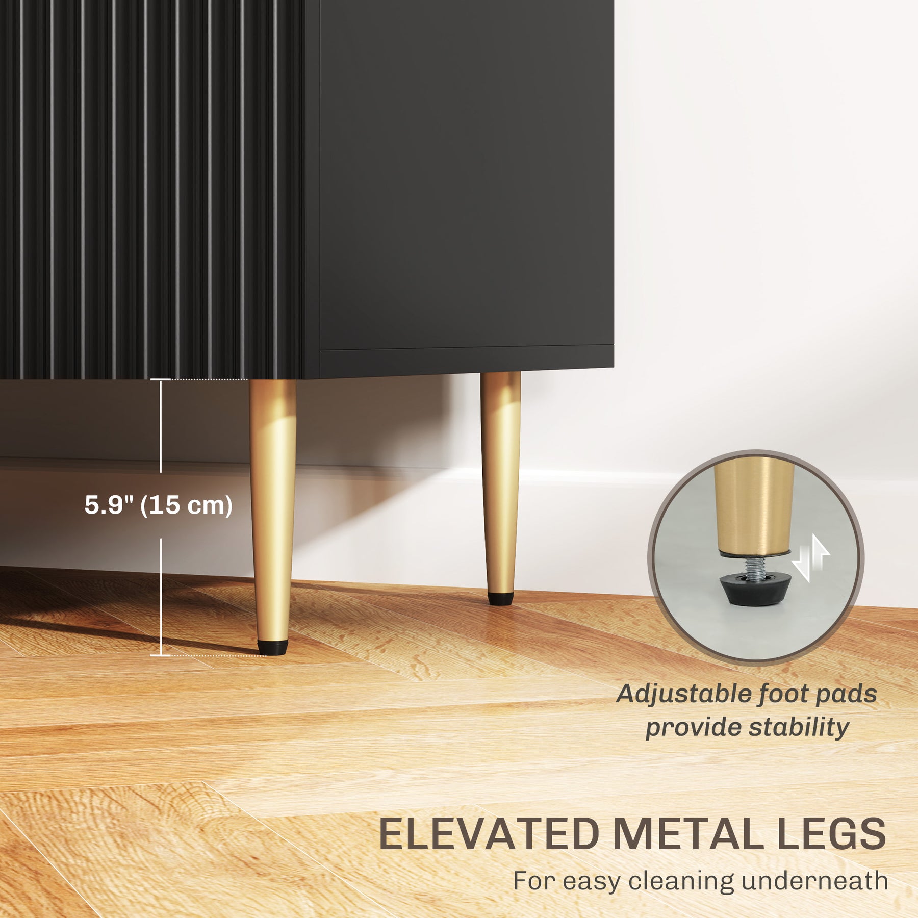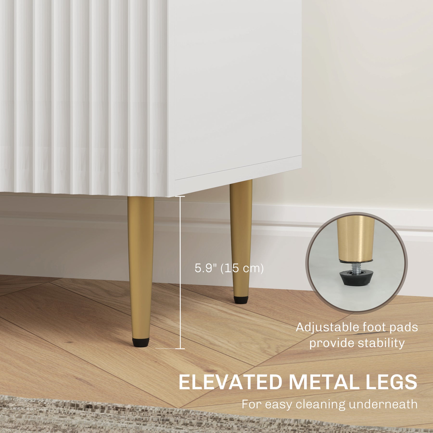 - • Metal legs, gold handles and fluted panel design give it a modern look