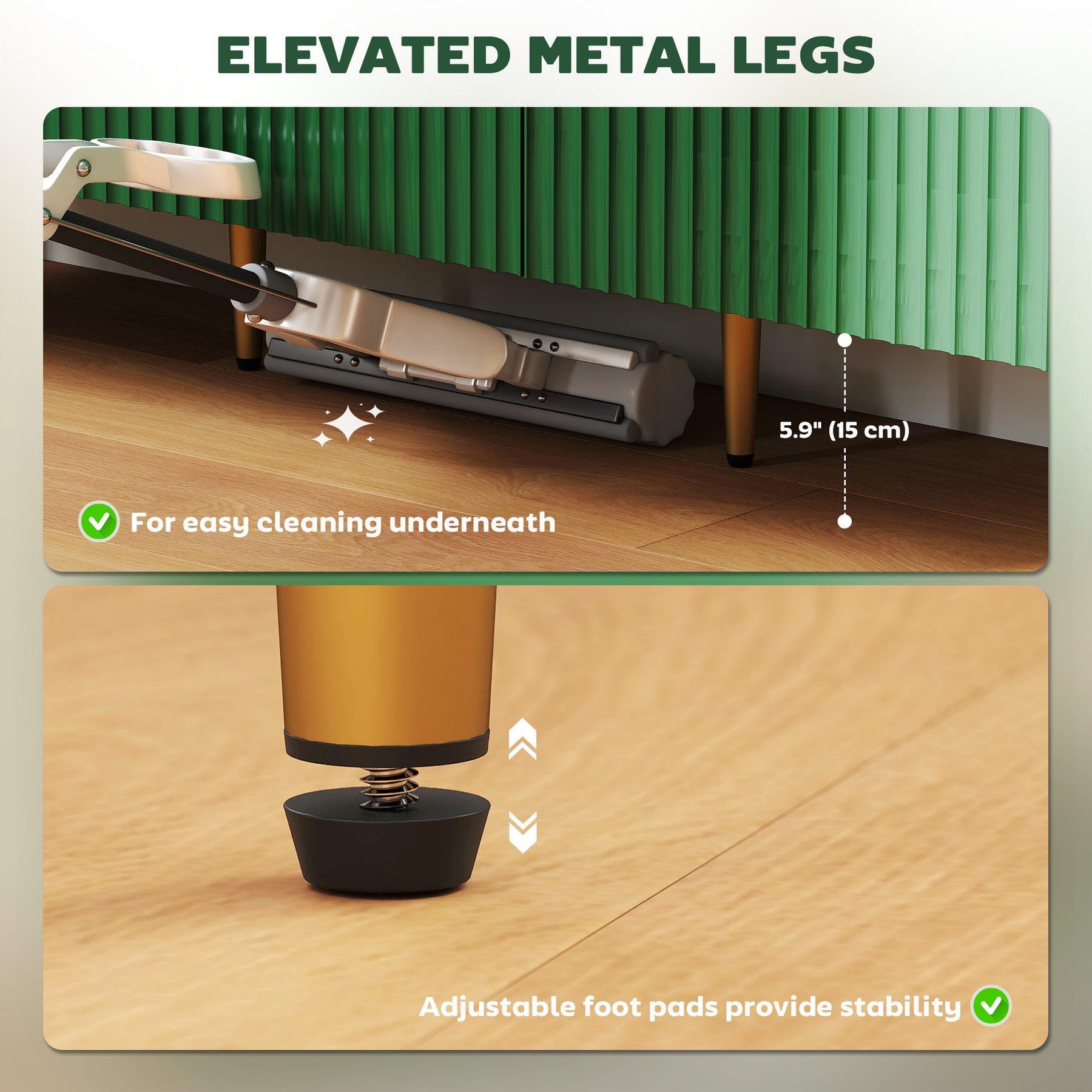 - • Elevated metal legs allow for simple underneath cleaning