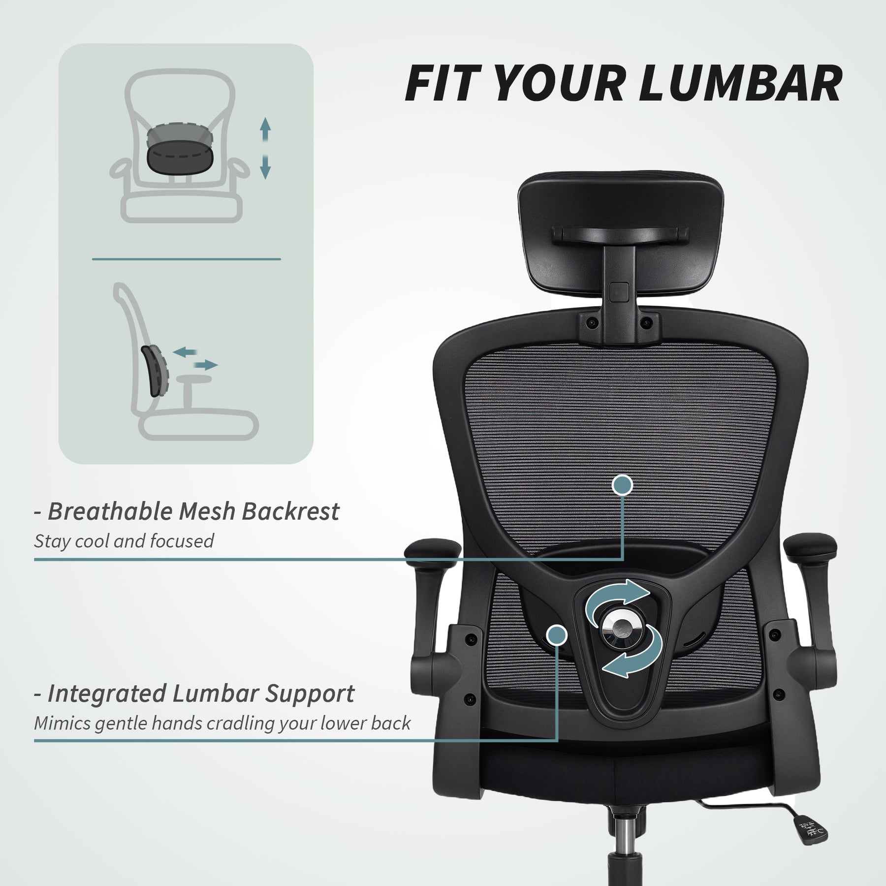Experience unparalleled comfort with our HOMCOM ergonomic office chair, designed for those long work hours. Enjoy full-body support with a rotatable headrest and versatile 4D lumbar support. Stay cool with our breathable mesh fabric, ensuring airflow to keep you comfy and focused. Great for any office or dorm, its space-saving design with 90° flip-up armrests maximizes your room's potential.