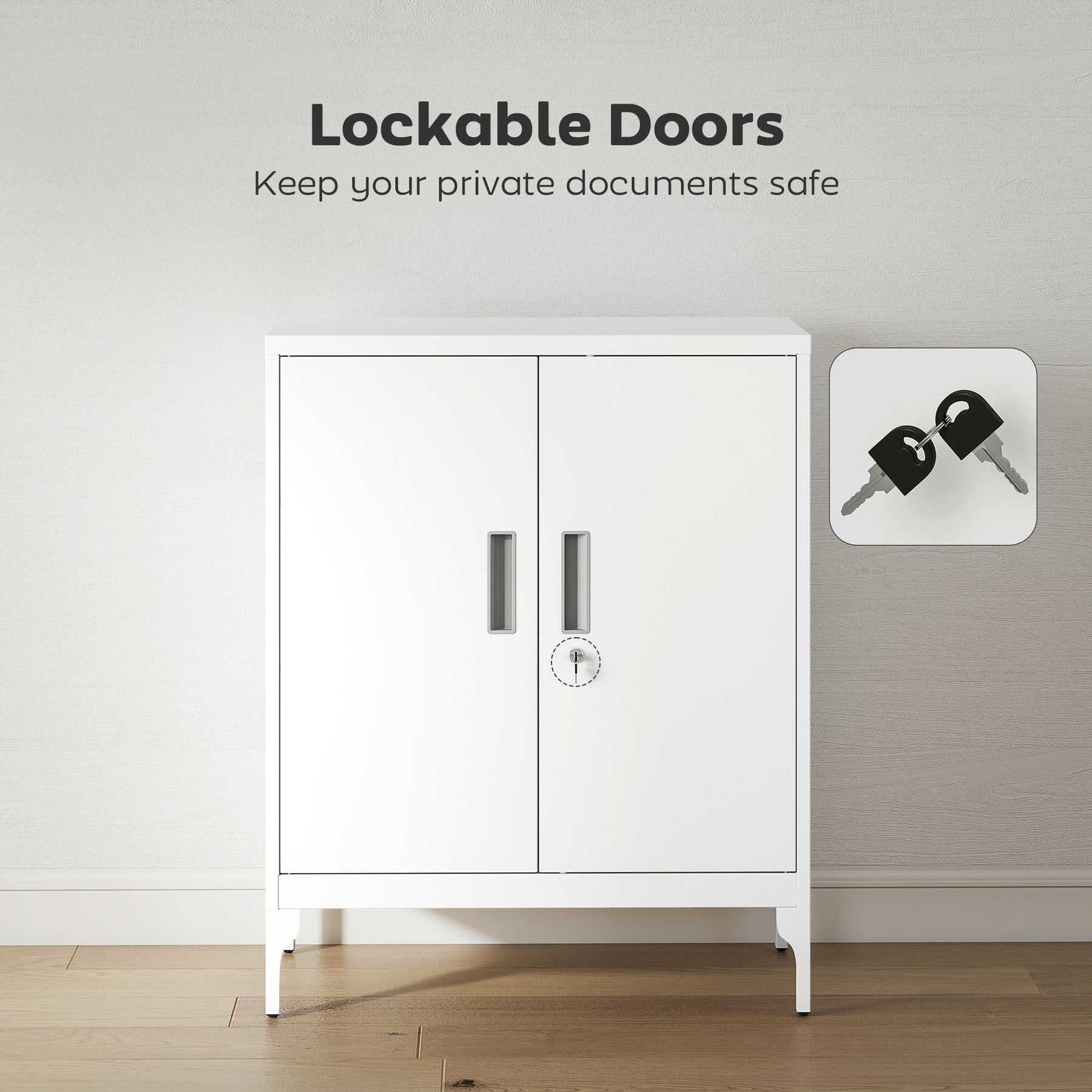 - • Lockable doors with two keys keep documents and personal items secure