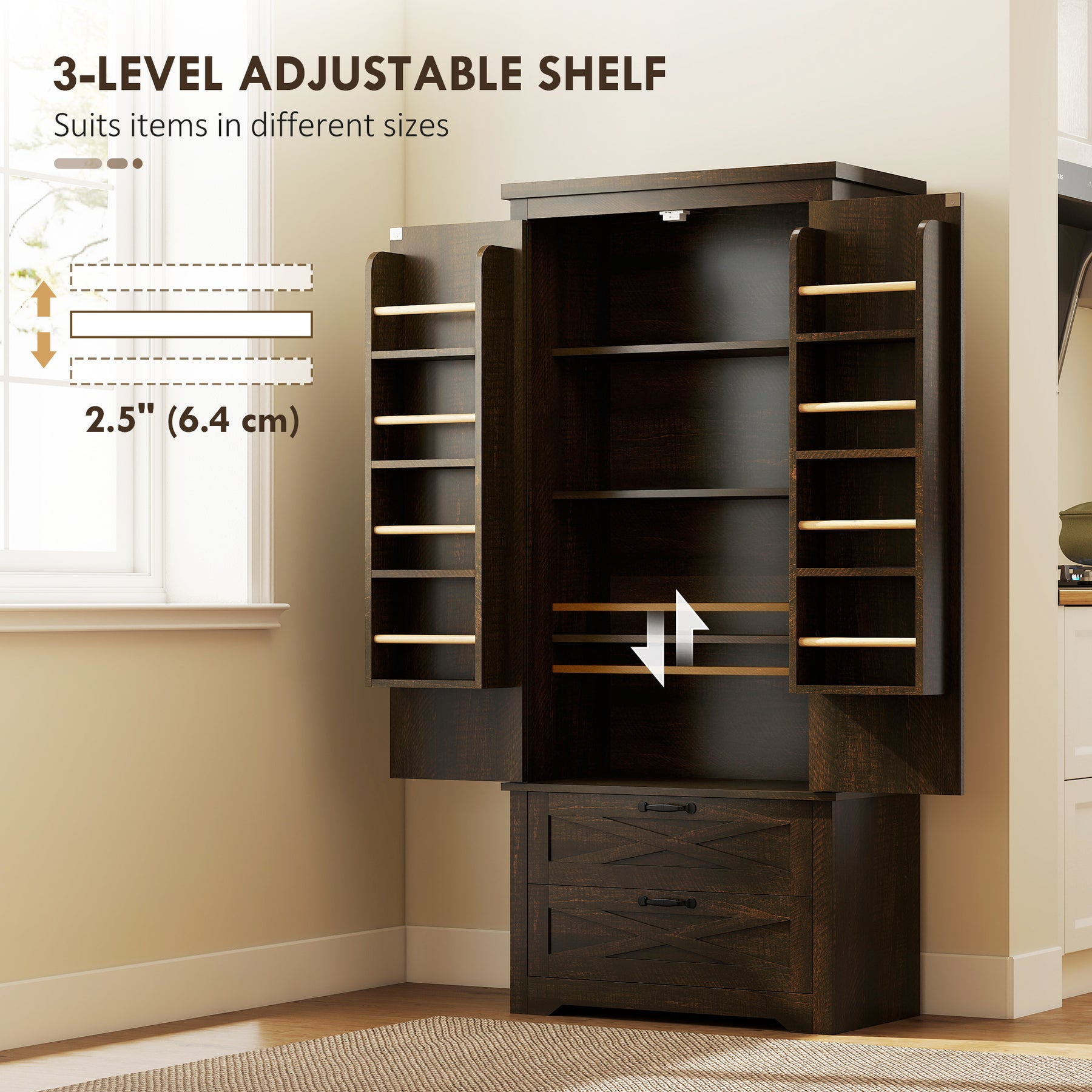 Add a touch of farmhouse flair to your kitchen with the HOMCOM kitchen pantry storage cabinet. Featuring a distressed white finish and charming barn doors, this kitchen pantry blends style with functionality. Organize effortlessly with a four-tier cabinet featuring adjustable shelves for flexible storage and two spacious drawers for tableware, along with eight door shelves for small items. Suitable for any kitchen needing extra storage with a hint of charm.