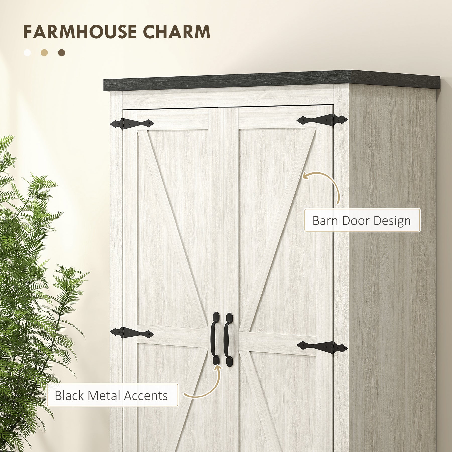 - • Distressed white pantry with barn doors and black accents exudes farmhouse charm