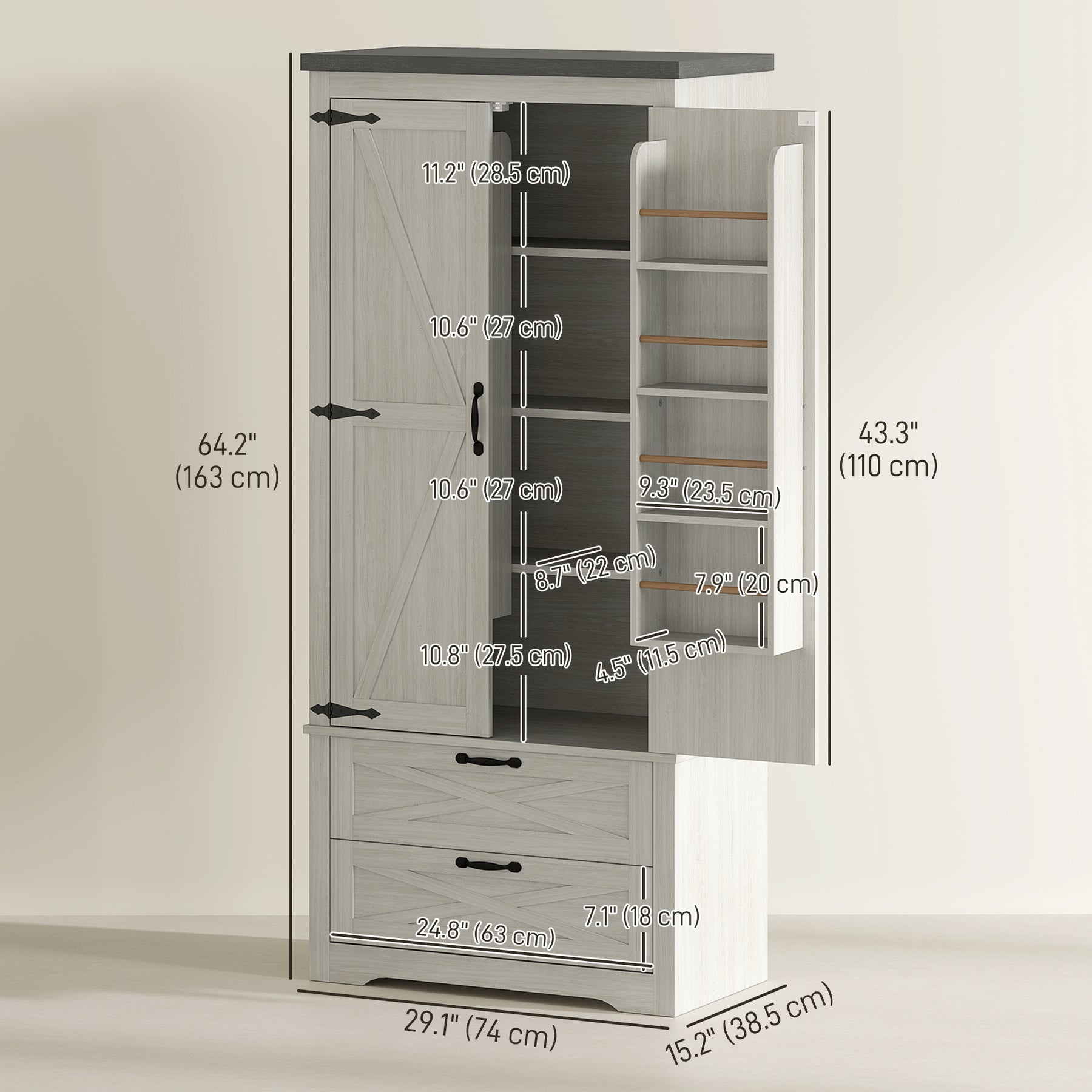 - • Overall Dimension: 29.1" W x 15.2" W x 64.2" H (74 x 38.5 x 163 cm)