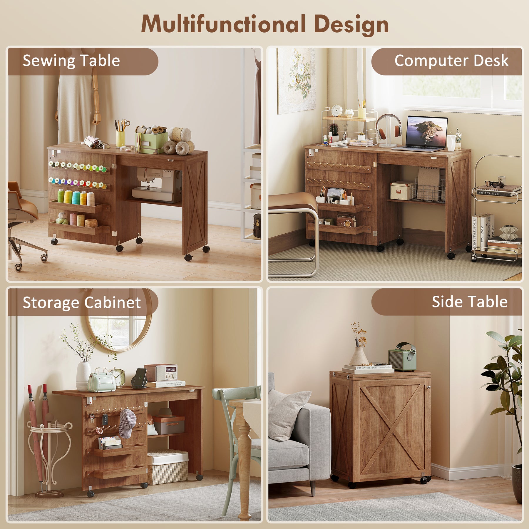 - • Foldable design transforms from a sewing table/computer desk to a compact cabinet/side table