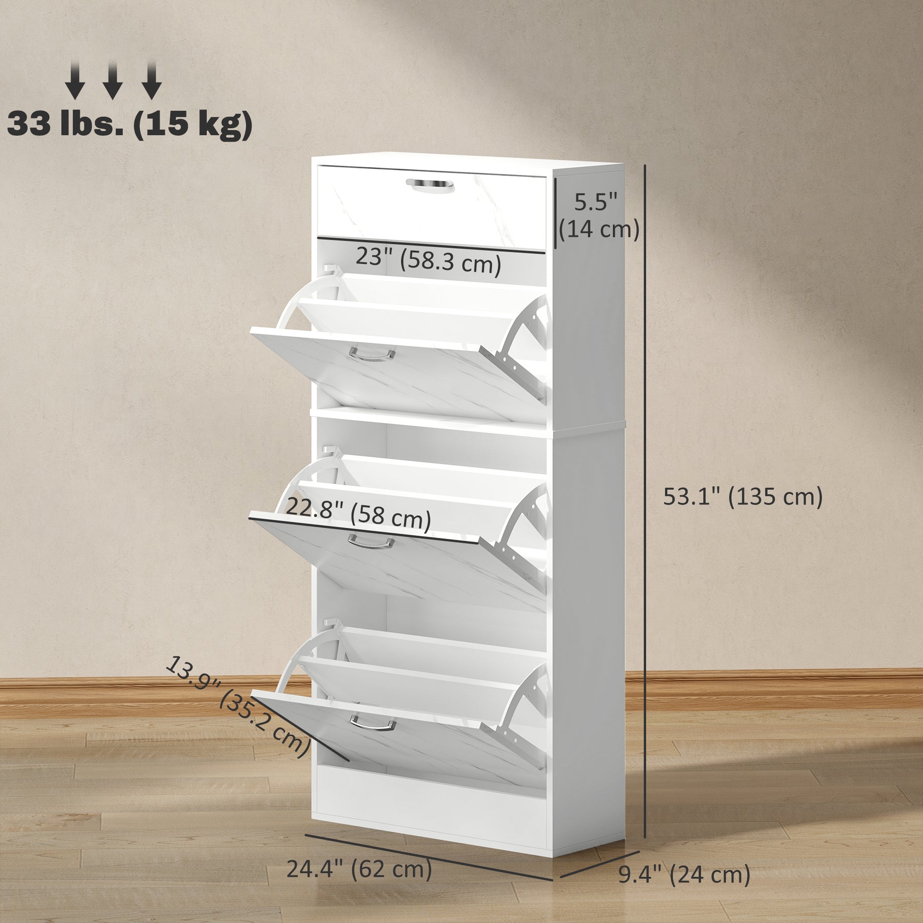 Choose this shoes cabinet from HOMCOM will keep your home tidy. There are three flip drawers, each can hold six pairs--great for use with the family or your flatmates. The inner shelf can be set to two different positions for storage, which fits your shoes better. Finished with a handy top drawer, offering even more storage. The marble shoe storage unit in modern style is a great addition to your home.