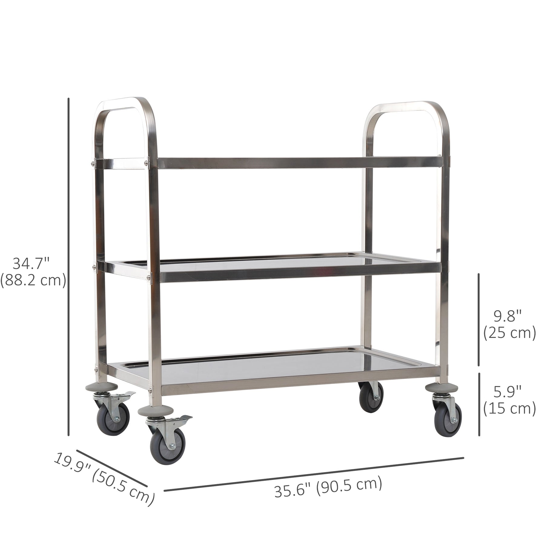 A clean kitchen makes for a clear mind. Made of heavy-duty stainless steel, this 3-tier kitchen cart on wheels offers ample storage for a variety of items and utensils. Four smooth rolling casters with two locking brakes make this bar cart super simple to move and relocate throughout the dining room, garage, laundry room, or office. Add a modern touch to your living space with this 3-tier rolling trolley cart from HOMCOM!