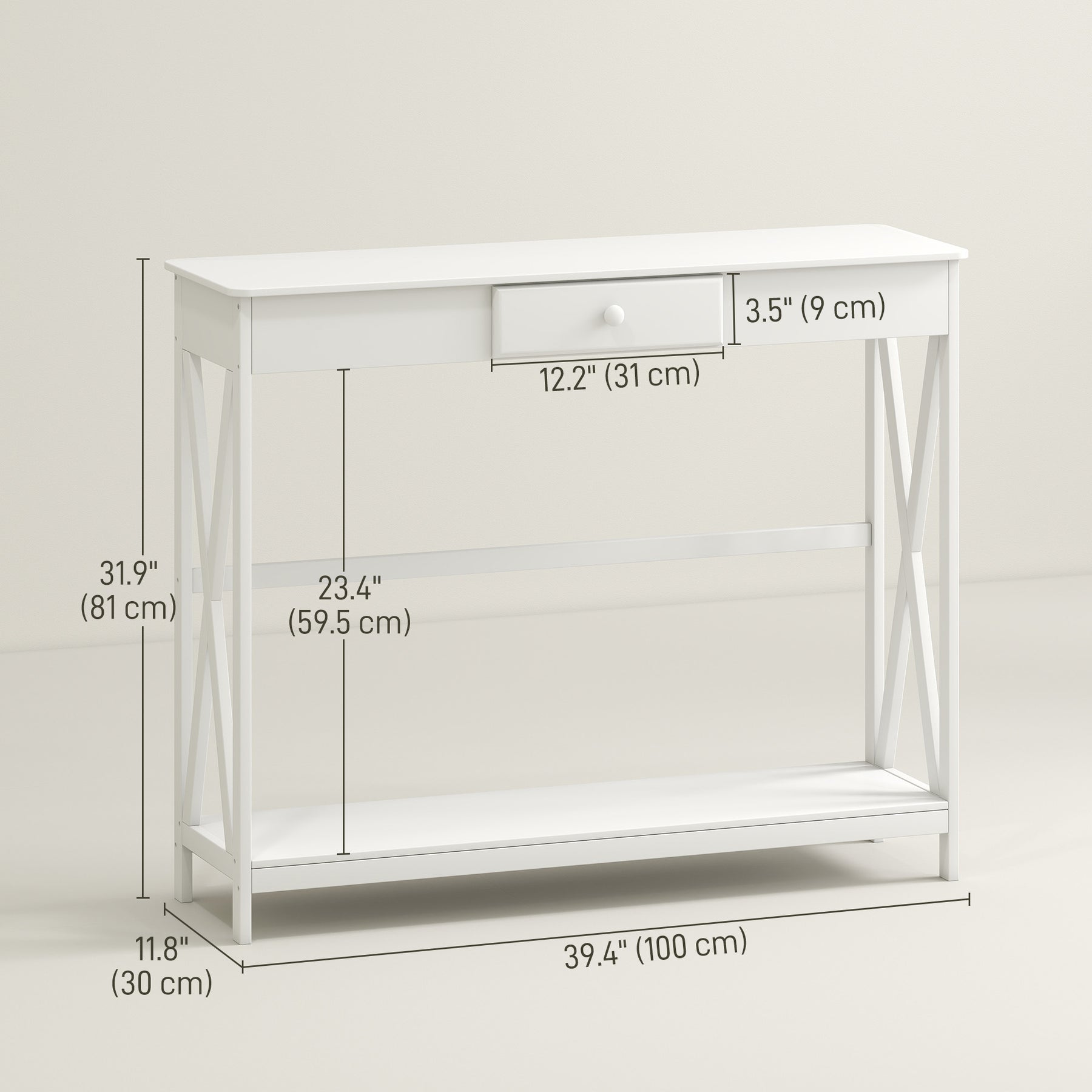 Are you looking for storage solutions and a decorative update for your entryway? Adding a console in a room can be a welcome jewel for displaying some favourite treasures. Our HOMCOM console table for entryway features a large desktop to display photographs, knick-knacks and much more and the open shelf underneath for you to place several container boxes, furthermore, you can use the drawer to store assorted items out of sight.