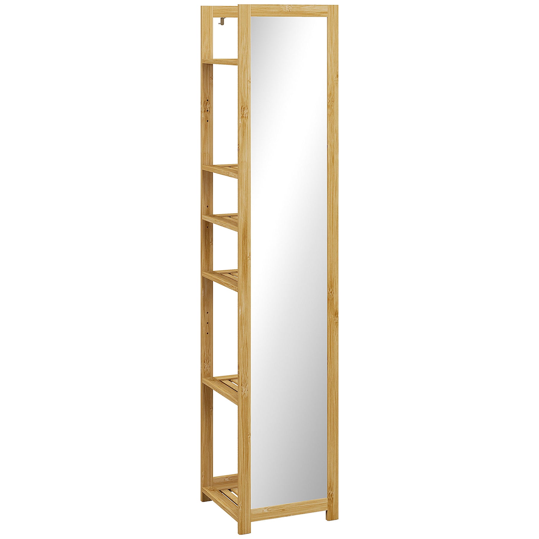 Maximize your space through floor mirror with shelf from HOMCOM. This bamboo unit features a full body mirror and six-tier shelf in a space-saving design, offering large space for all your essentials while allow you to check appearance. This HOMCOM 2-in-1 big mirror with storage complements any decor while keeping your space tidy and organized.