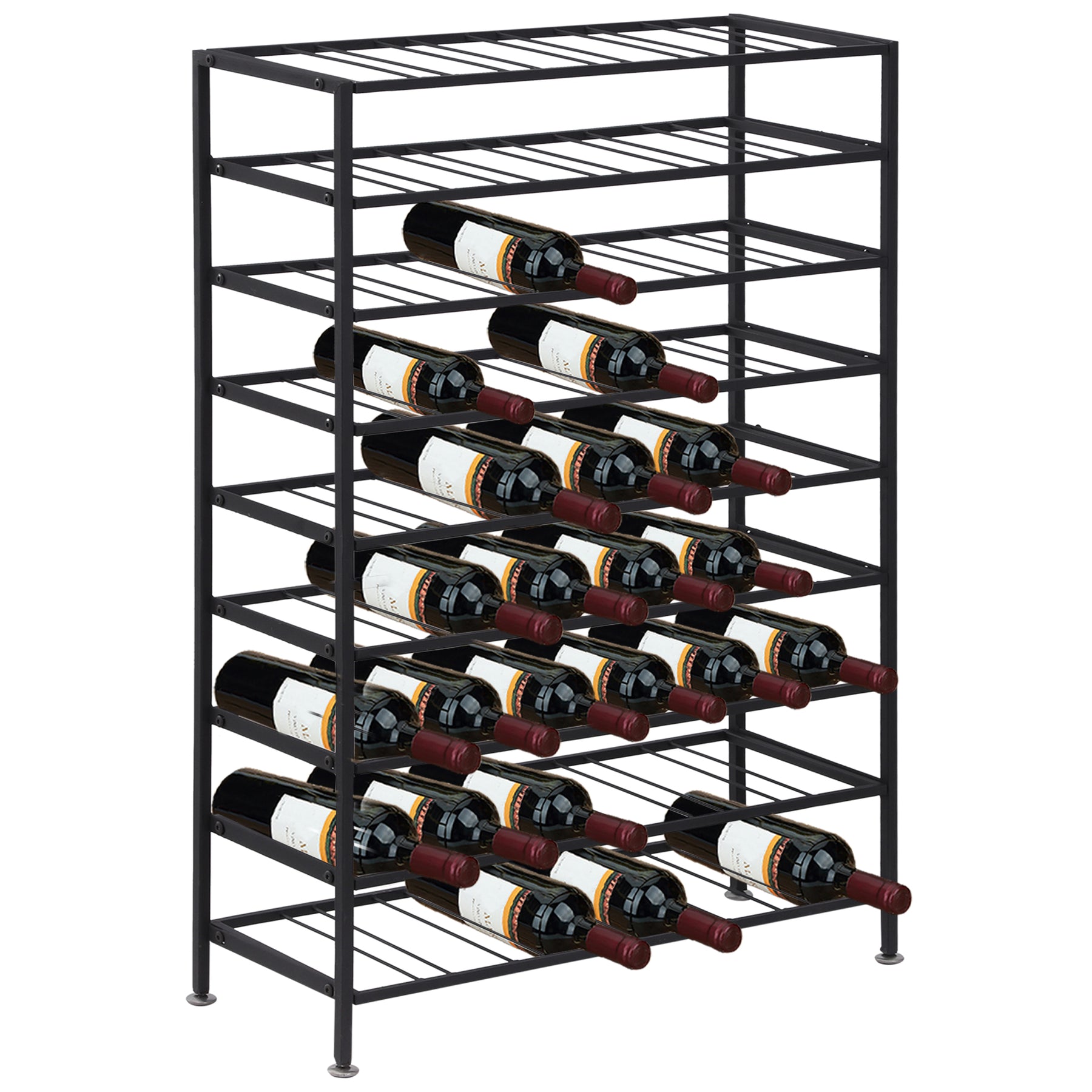 - • Nine tier shelves can hold up to 54 bottles in total