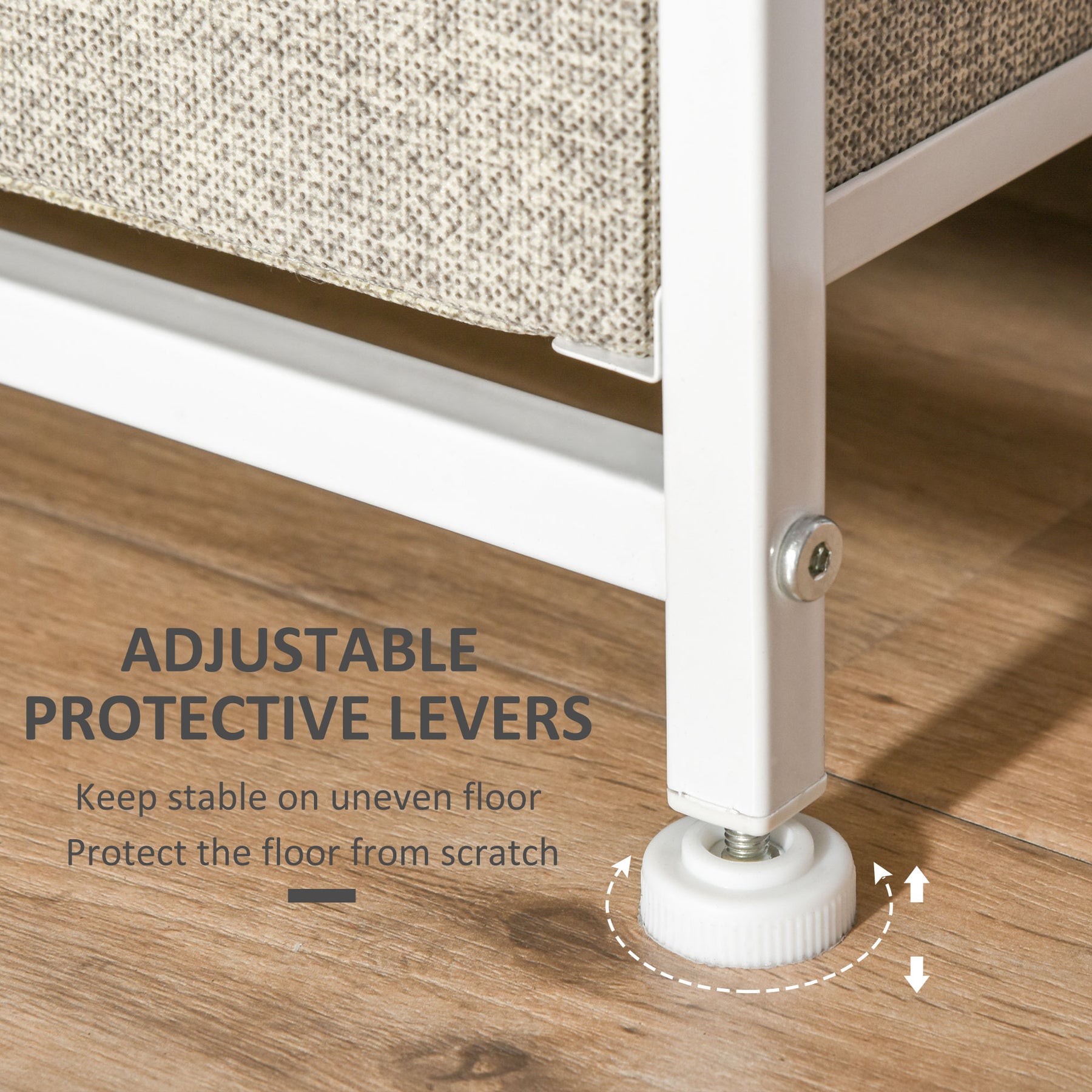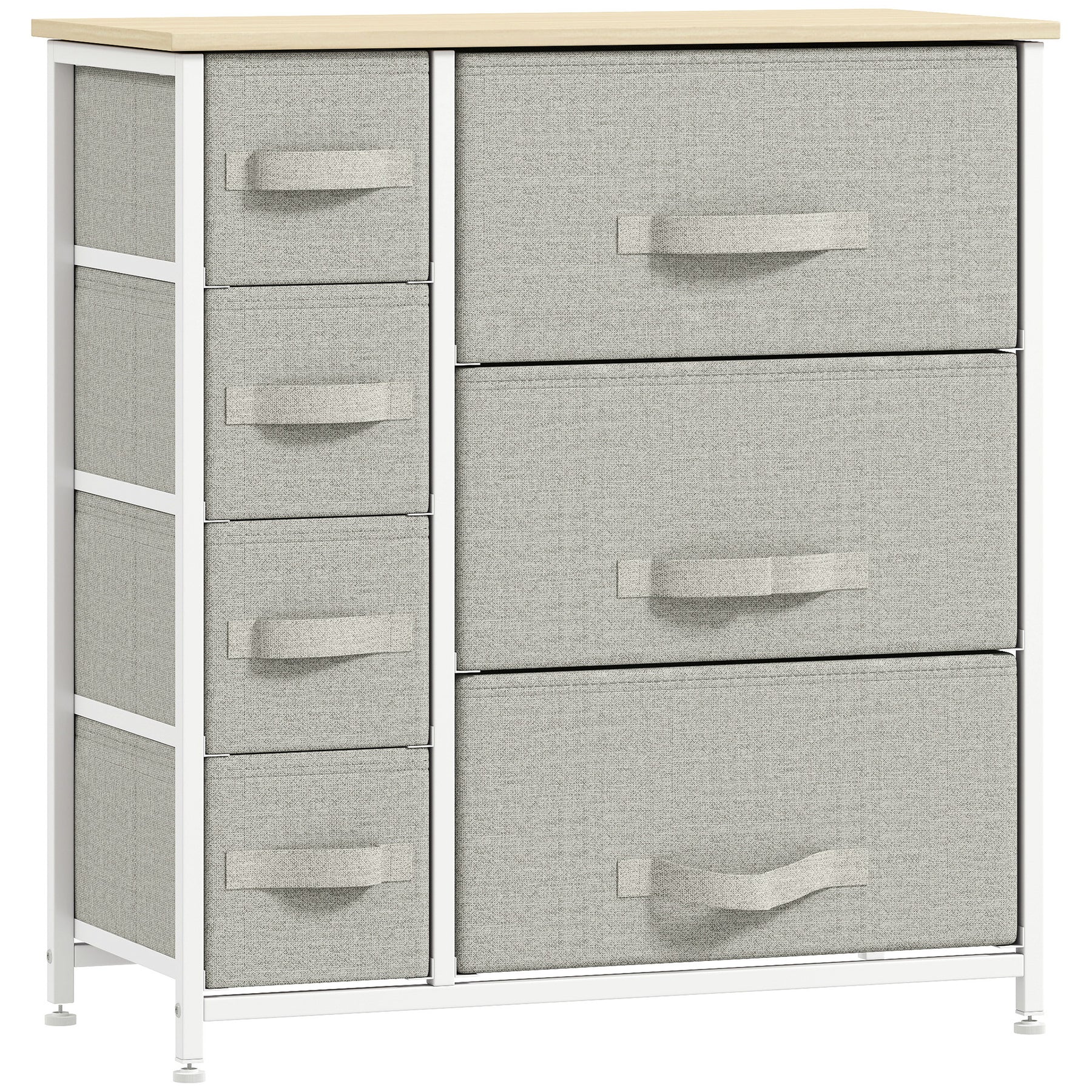This HOMCOM chest of drawers for bedroom is a great addition to keep your things organized. It features a robust steel frame and an engineered wood top for reliable display. With four small drawers and three large ones, it offers ample storage space for clothes and more. The adjustable feet enhance the stability, making it great as a bedroom dresser, side table, or chic grey fabric dresser for any modern space.