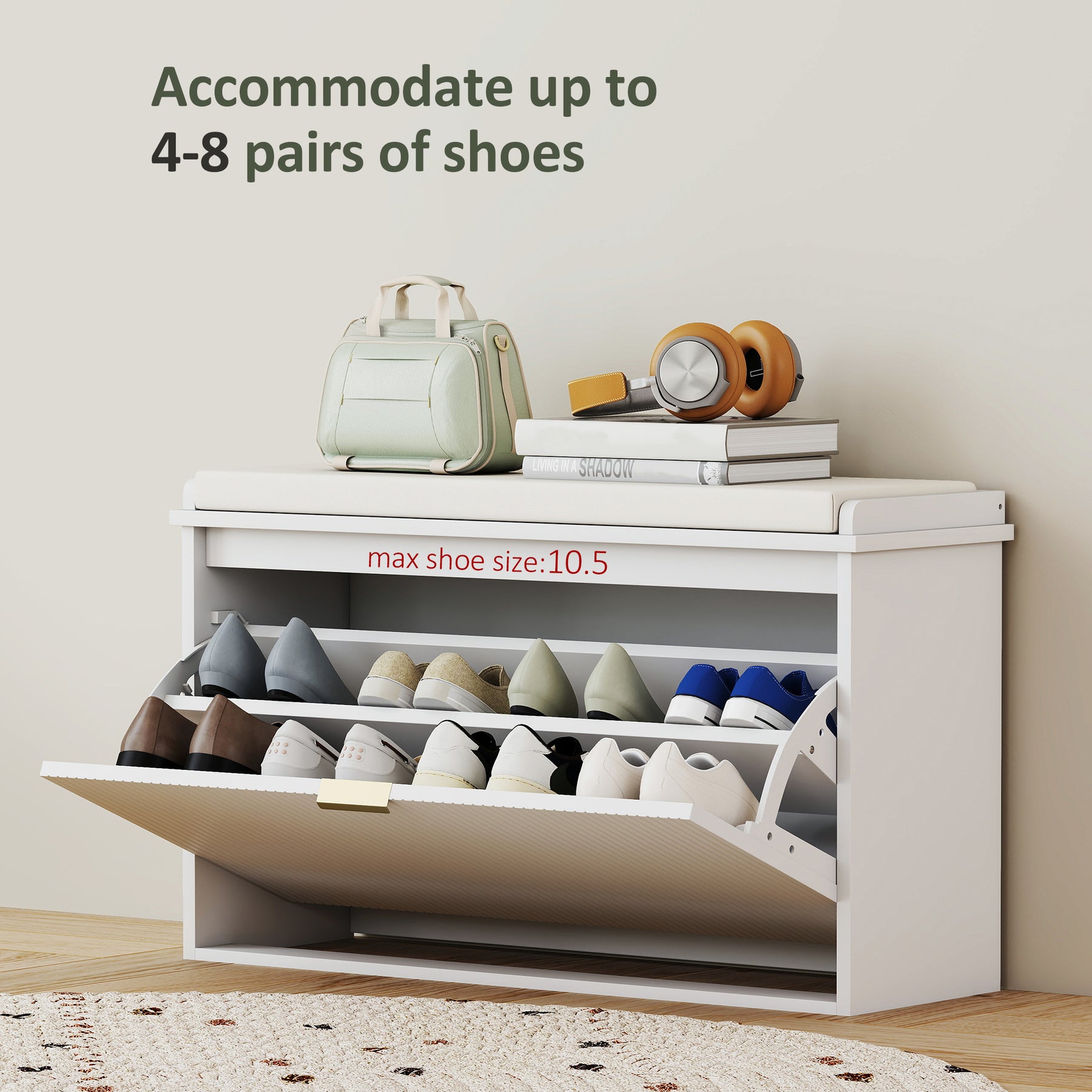 - • Compact shoe storage bench saves entryway space