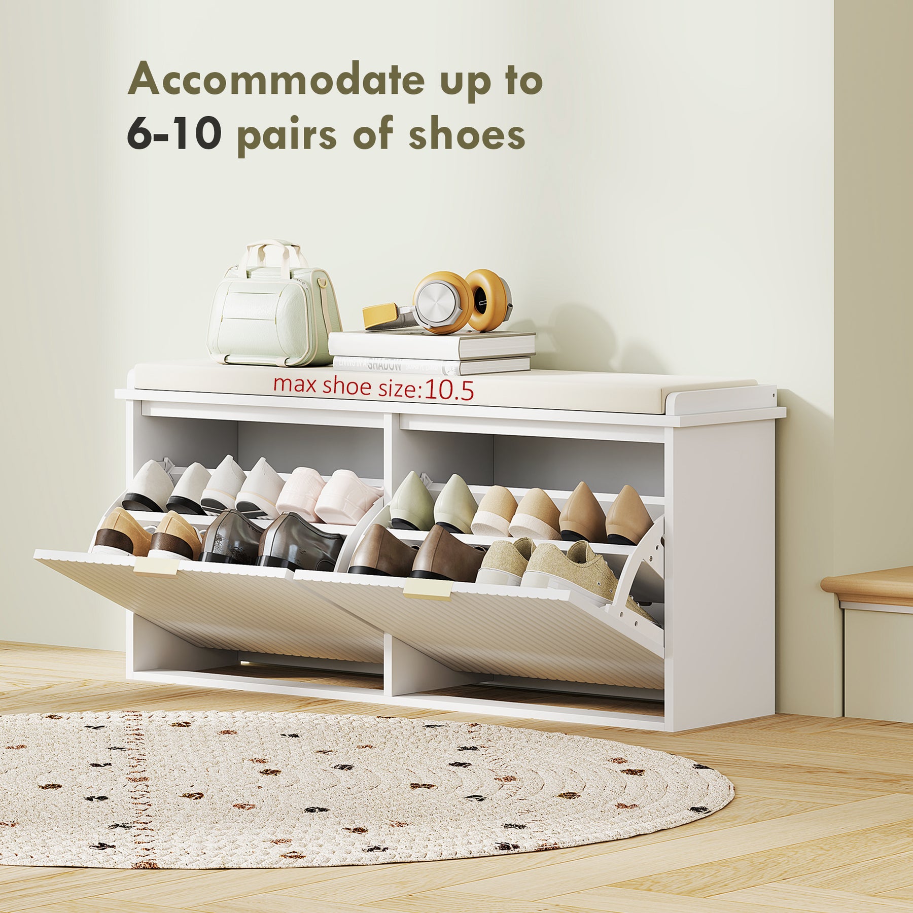 - • Compact shoe storage bench saves entryway space