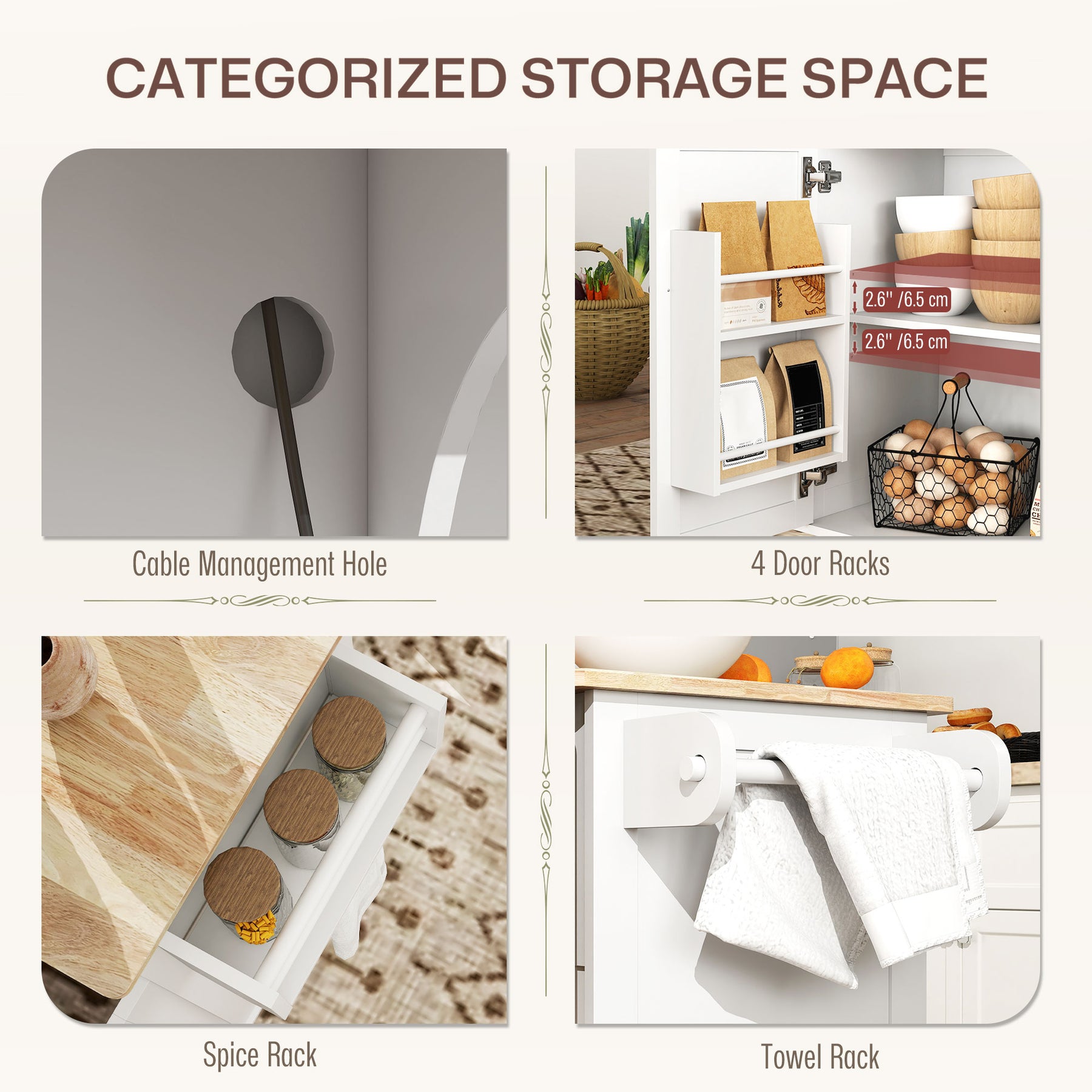 - • Sorted storage with three drawers for utensils, two cabinets for pots and pans, and four door racks for seasoning bottles